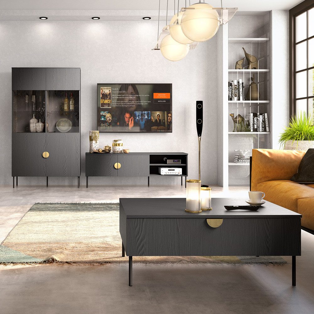 Erhältlich in warmem Eiche-Dekor oder elegantem Schwarz, passt diese Serie perfekt in moderne und klassische Wohnräume. Besonders herausstechend sind die runden Griffe, die wie ein Halbmond an den Fronten erscheinen und den Möbeln einen einzigartigen, charmanten Look verleihen. Die Schubladen sind mit einer Softclose-Funktion ausgestattet, um sanftes und geräuschloses Спрятать zu ermöglichen. Diese Serie kombiniert Stil und Komfort, um deinem Zuhause einen luxuriösen, modernen Charakter zu verleihen.
