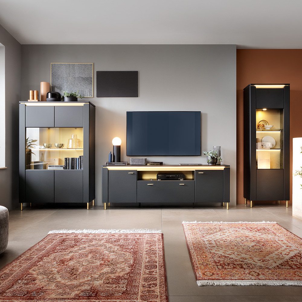 Diese 3-teilige Wohnwand in edlem Schwarz matt mit goldfarbenen Akzenten und integrierter Akzentbeleuchtung kombiniert modernes Design mit praktischer Funktionalität. Die Vitrinen bieten stilvollen Stauraum für Gläser, Geschirr oder dekorative Lieblingsstücke, während der Fernsehschrank Platz für Technik, Zubehör und Dekoration schafft. Dank der widerstandsfähigen Melaminharzbeschichtung sind die Möbel unempfindlich gegenüber äußeren Einflüssen. Die Kombination aus hochwertigen Materialien und elegantem Look macht das Set zu einem stilvollen Highlight im Wohnzimmer – ideal für entspannte Abende, die Präsentation dekorativer Elemente oder ein aufgeräumtes Wohnambiente.