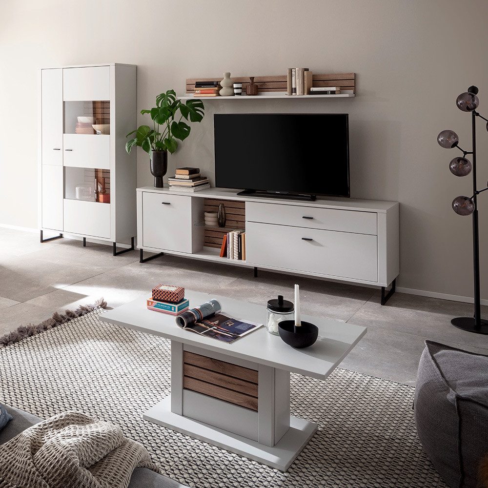 Verzaubere dein Zuhause mit unserer eleganten Wohn- und Esszimmermöbelserie in weiß, akzentuiert durch Lamellen in Eiche Nb.