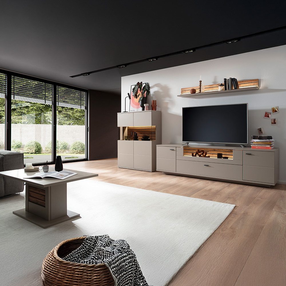 Dieses stilvolle Wohnzimmer-Set aus Highboard, Fernsehschrank, Wandregal und Couchtisch verbindet modernes Design mit praktischen Stauraumlösungen. Die Kombination aus sanftem Basaltgrau und warmem Wotan-Eiche-Dekor schafft eine gemütliche Wohnatmosphäre. Integrierte LED-Beleuchtung setzt dekorative Highlights im Highboard, Fernsehschrank und Wandregal perfekt in Szene. Glasdetails verleihen dem Highboard und Fernsehschrank eine leichte Optik, während die robuste, pflegeleichte Melaminbeschichtung für eine langlebige Qualität sorgt – ideal für ein stilvolles und aufgeräumtes Zuhause.