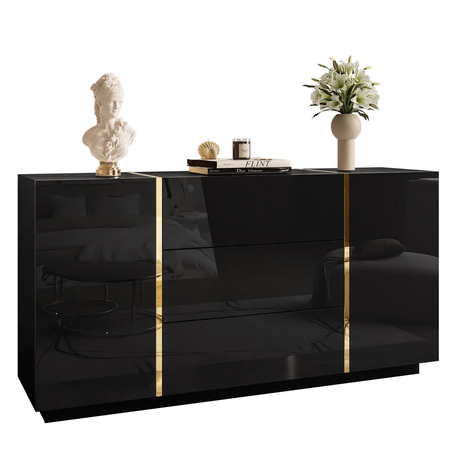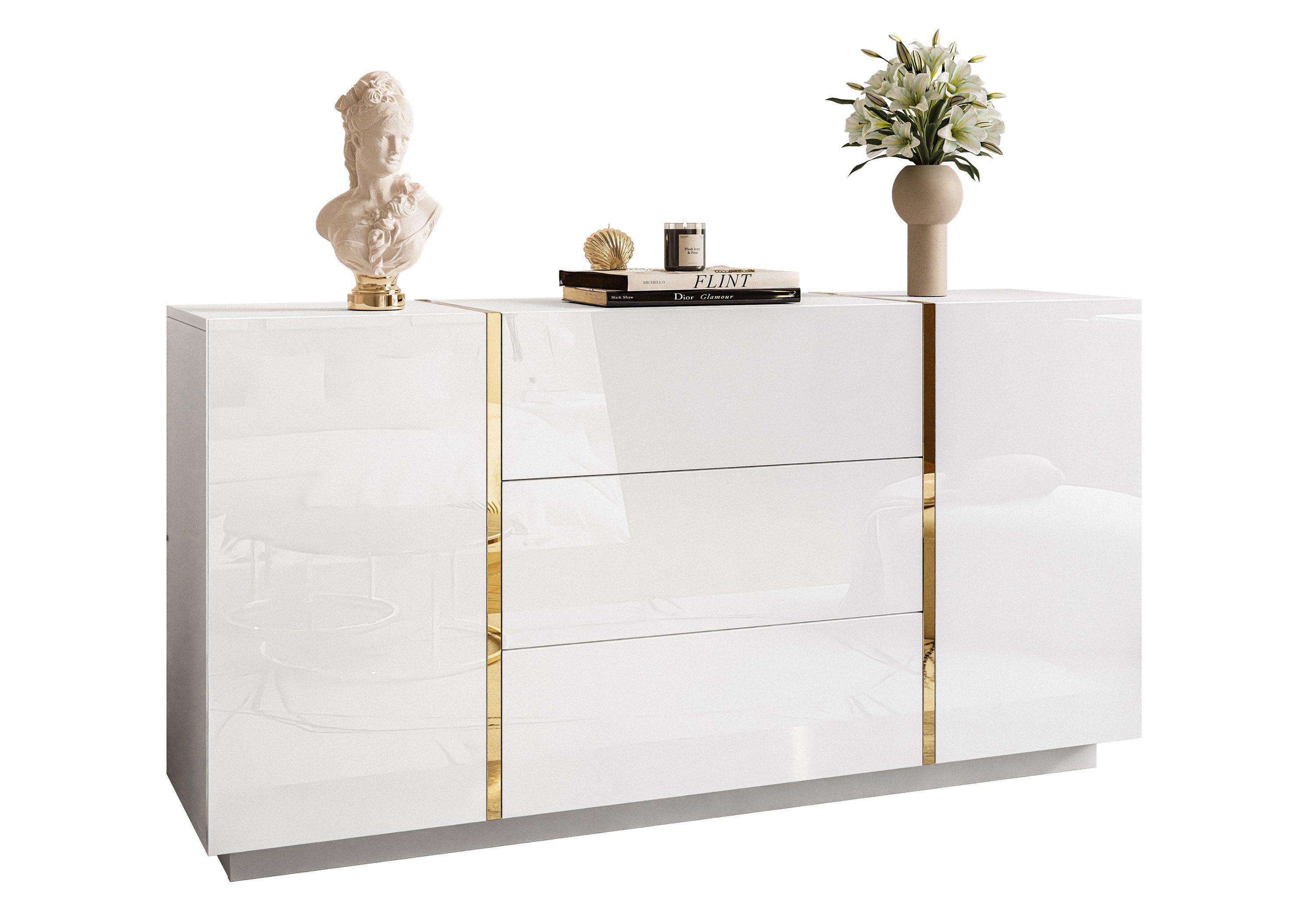 Weiße oder schwarze Hochglanzfronten in Kombination mit eleganten goldenen Akzenten in chromfarbener Ausführung machen die ONYX-Kommode zu einem Premium-Möbelstück. Ideal für moderne Wohnräume.