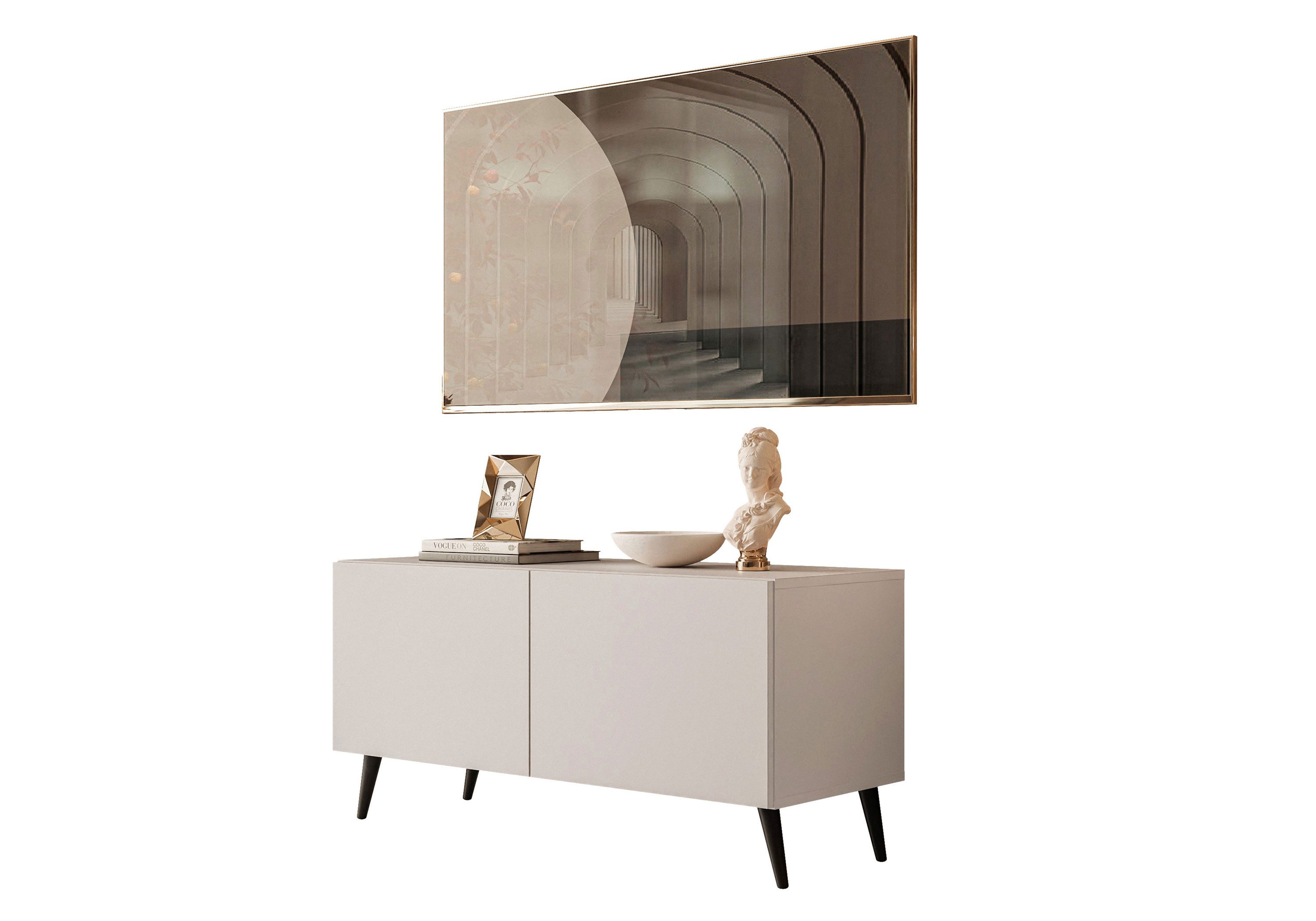 Die schräge Beine aus Metall in bis zu drei Farben zur Auswahl sind ein markanter Akzent, der dem Schrank nicht nur Stabilität, sondern auch eine einzigartige Leichtigkeit und Dynamik verleiht. Ihre geometrische Form bildet einen interessanten Kontrast zum schlichten Korpus des Schranks und verleiht dem gesamten Möbelstück einen modernen Look.