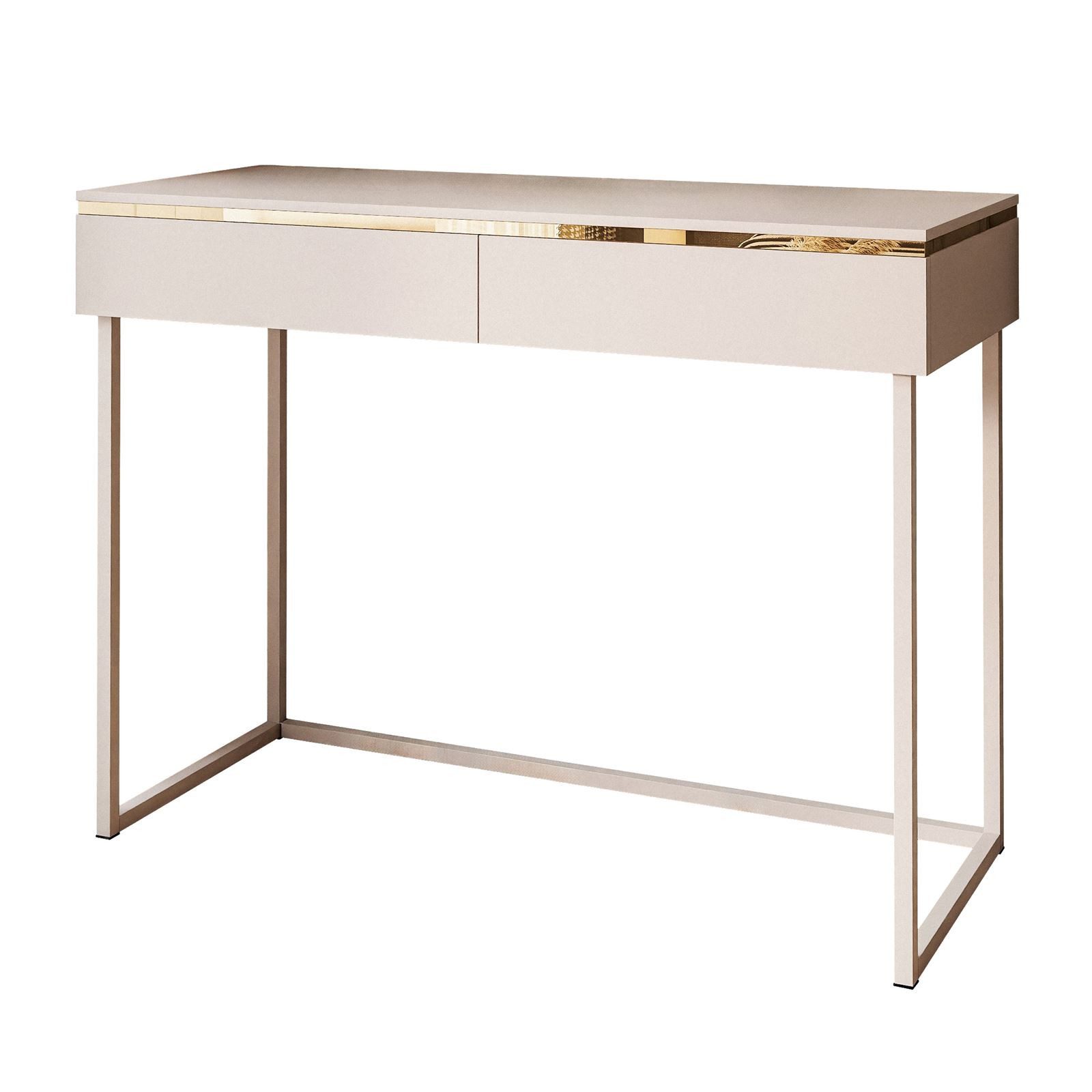 Die trendige Kaschmir-Farbe verleiht dem Schminktisch eine subtile und elegante Ausstrahlung. So fügt er sich harmonisch in eine Vielzahl von Einrichtungsstilen ein, von modern bis klassisch. Der goldene Streifen um den Schminktisch setzt einen zarten Akzent, der ins Auge fällt und den exklusiven Charakter der Kommode unterstreicht.
