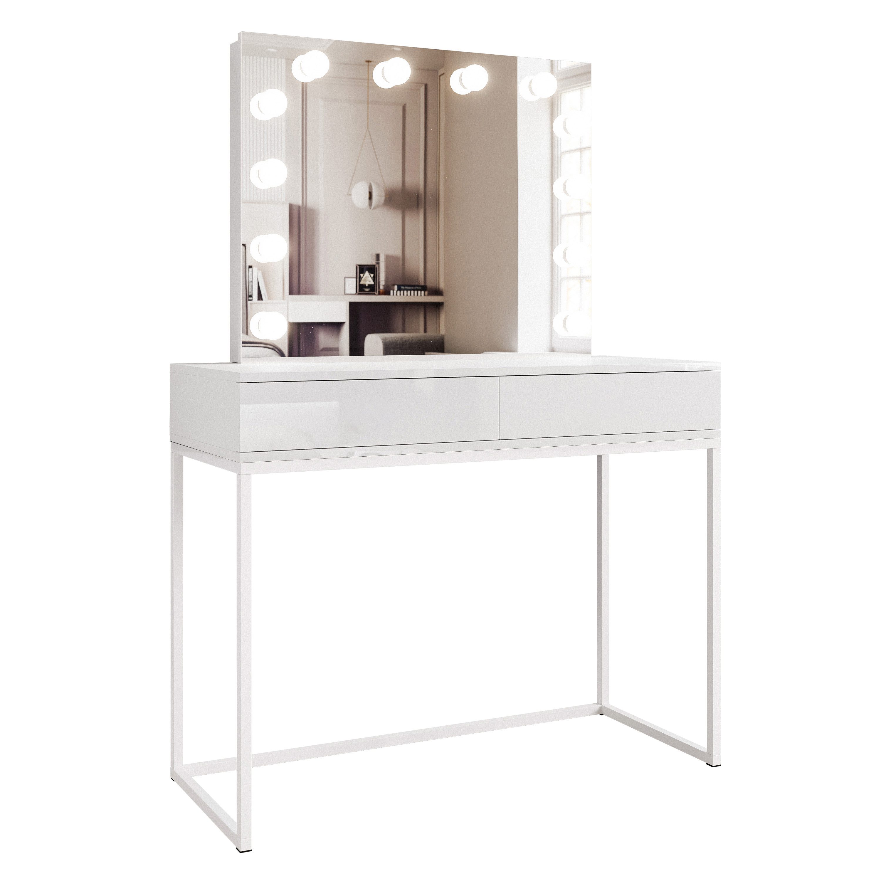 Doch das ist nicht alles, was der BLANCO Schminktisch zu bieten hat. Der große Spiegel mit 12 farbneutralen LED Lampen hebt den Schminktisch von anderen ab. Er bietet die perfekte Ausleuchtung für präzises Make-up und Hautpflege. Er sorgt dafür, dass jedes Detail in unserem Gesicht perfekt zu sehen ist und das Make-up bei dieser Beleuchtung präzise und professionell wirkt.