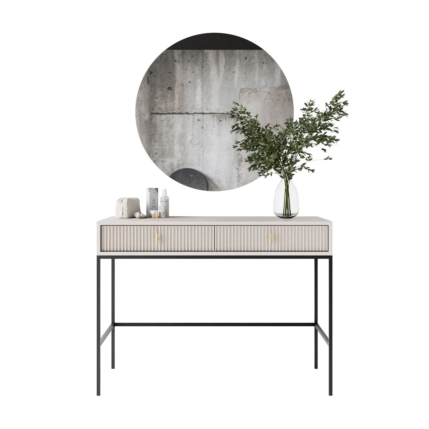 Zwei geräumige Schubladen mit geriffelten Fronten bieten praktischen Stauraum für Kosmetika und Accessoires, während minimalistische goldene Griffe den subtilen Charakter des Möbelstücks betonen. Das stabile schwarze Gestell verleiht Leichtigkeit und Modernität, und der Spiegel mit integrierter LED-Beleuchtung sorgt für ideale Bedingungen beim Schminken und Pflegen.
