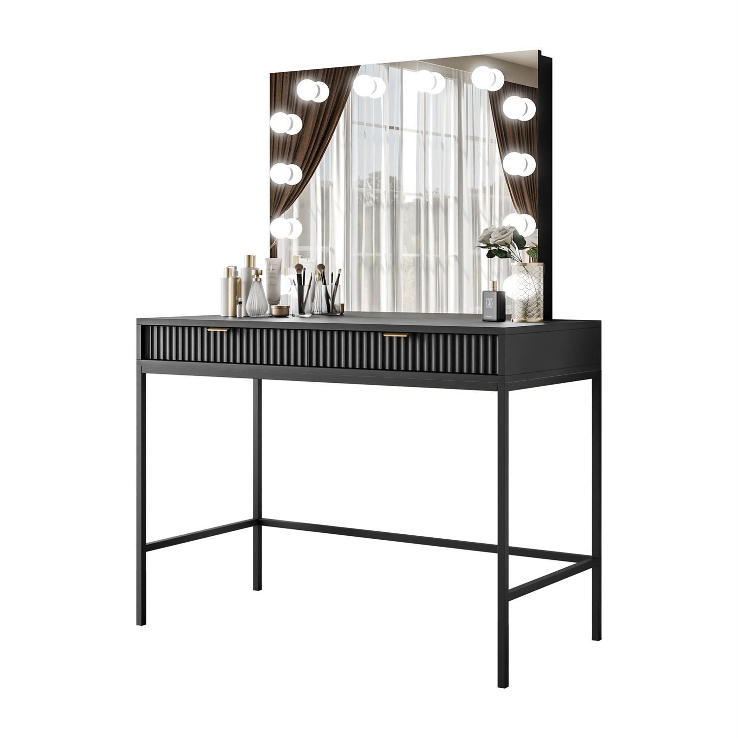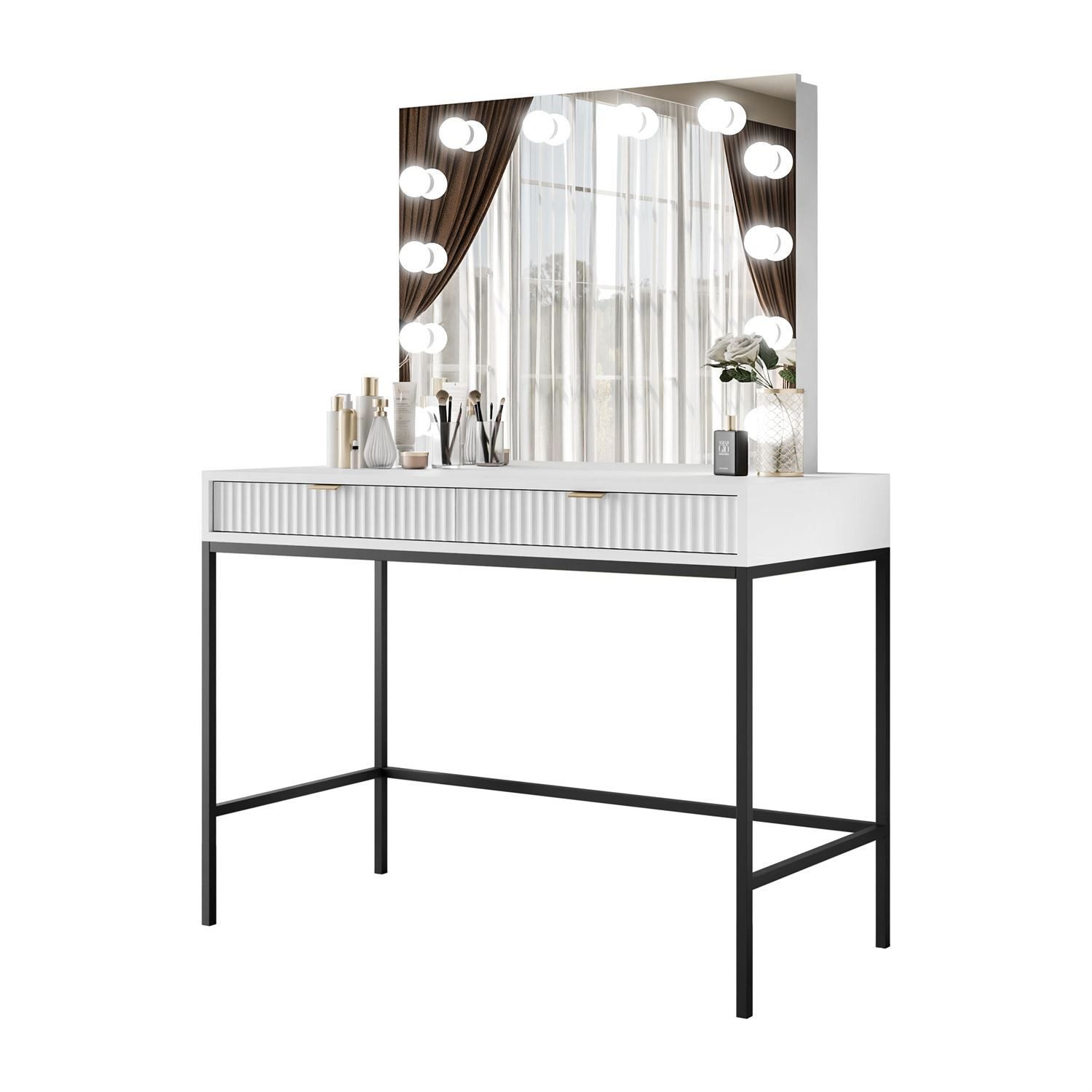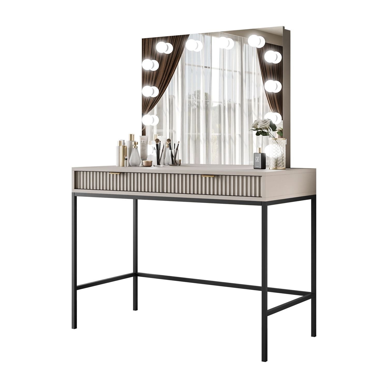 Es ist erwähnenswert, dass der Schminktisch Cortado Elite mit einem großen Spiegel ausgestattet ist, der von einem Kranz aus zwölf eleganten Glühbirnen umgeben ist. Ihre symmetrische Anordnung sorgt für eine perfekte Beleuchtung, mit der du dein Make-up auf höchstem Niveau auftragen kannst.