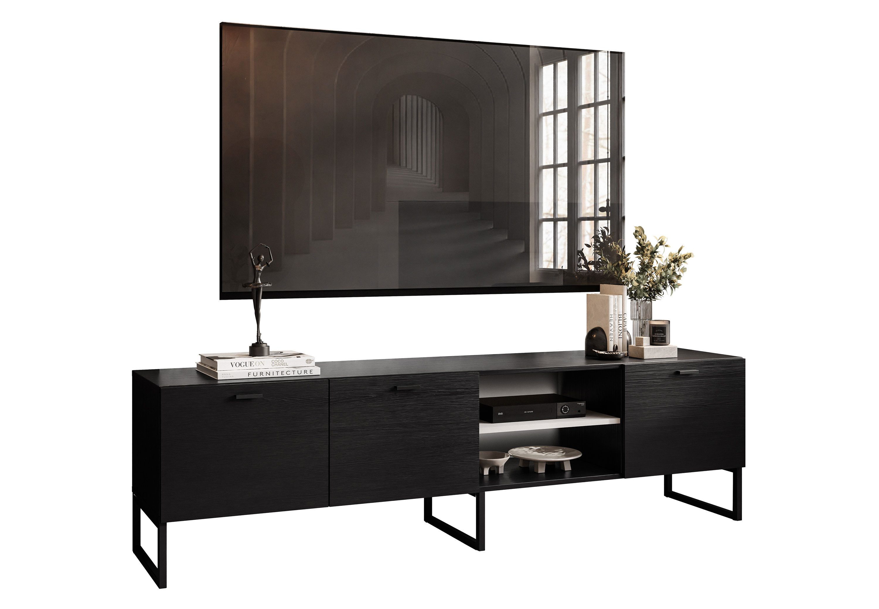 Der 185 cm breite TV-Schrank MOONLIGHT, erhältlich in zwei beeindruckenden Farben, ist eine perfekte Lösung, die viel Platz für die Aufbewahrung sowohl elektronischer Geräte als auch geschmackvoller Dekorationen bietet.