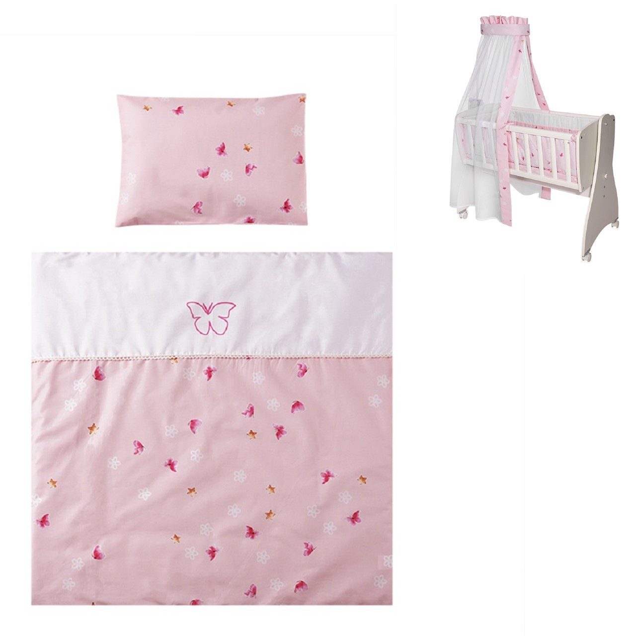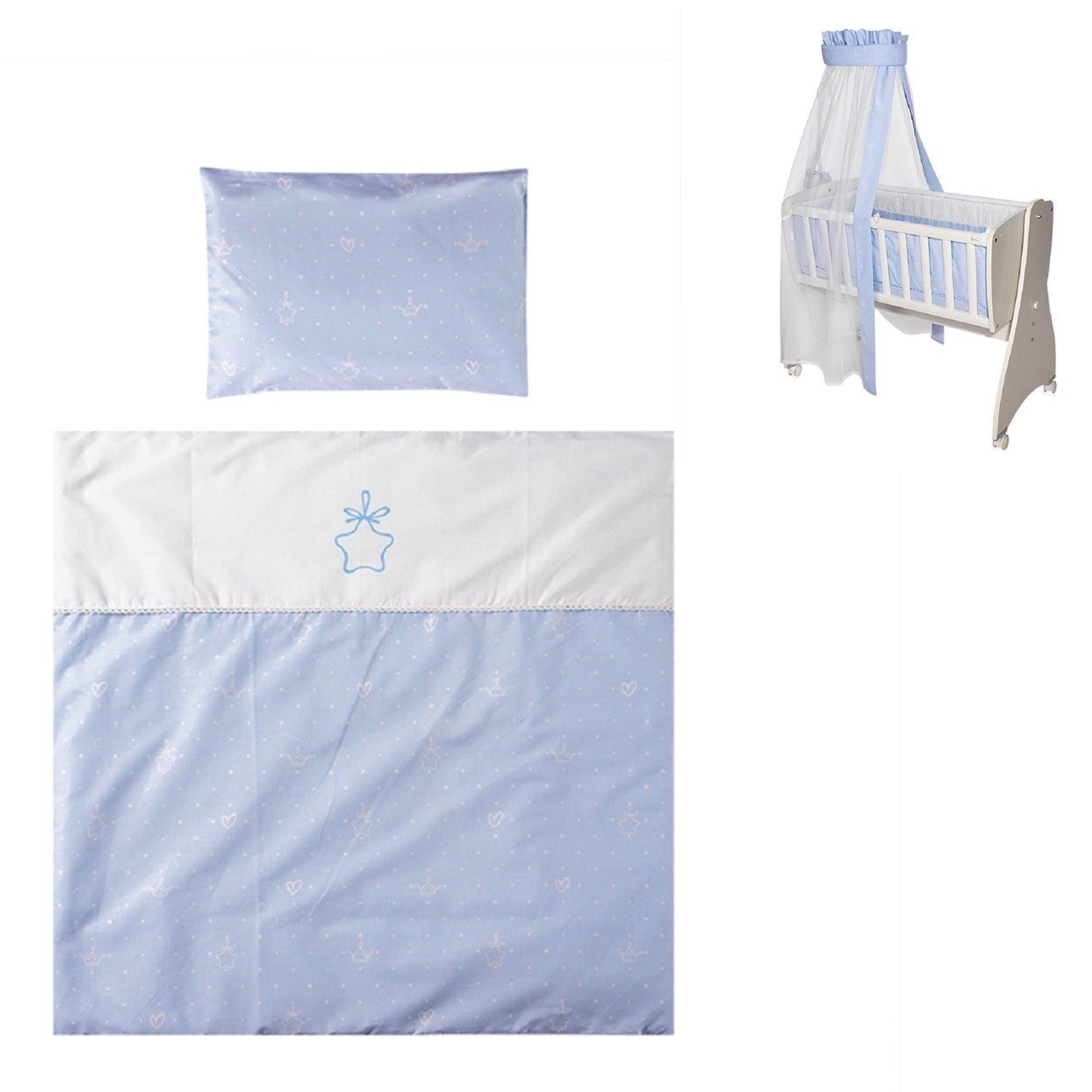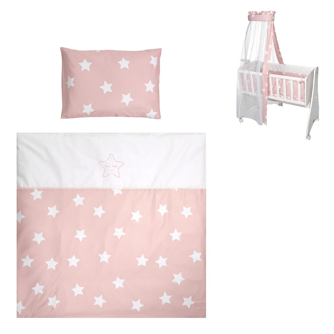 Das 7-teilige Baby-Bettwäsche Zubehör Set von Lorelli ist die perfekte Ergänzung zur Babyschaukel First Dreams. Die Babyschaukel ist nicht im Lieferumfang enthalten. Das Set besteht aus einer gepolsterten Bettdecke, einem Kopfkissen, dazu passenden Bezügen, Bettlaken, Nestchen sowie einem Betthimmel. Die Bezüge sind aus 100% Baumwolle und zum Waschen abnehmbar. Die Füllungen von Kissen, Bettdecke, Nestchen sowie der Betthimmel sind aus 100 % Polyester gefertigt. Ihr Baby wird sich in diesem Bettwäsche Set rundum wohl fühlen.