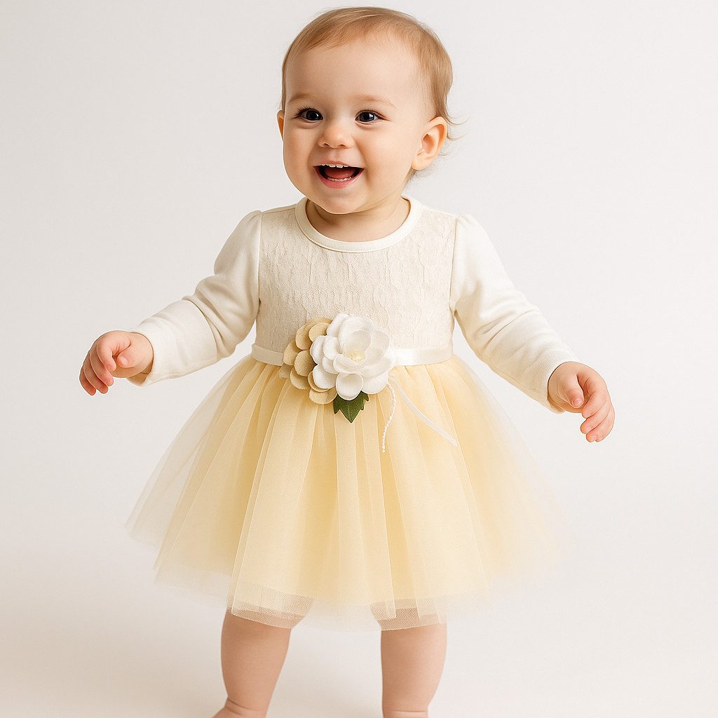 Dieses entzückende Baby-Kleid ist ein echter Hingucker für festliche Anlässe. Es kombiniert ein weiches, cremefarbenes Langarm-Oberteil mit einem zart-gelben Tüllrock, der dem Outfit eine elegante und zugleich verspielte Note verleiht. Ein besonderes Highlight ist die große Blumenapplikation in Weiß mit grünen Blättern und Schleife in der Taille – liebevoll verarbeitet und perfekt auf das Design abgestimmt.