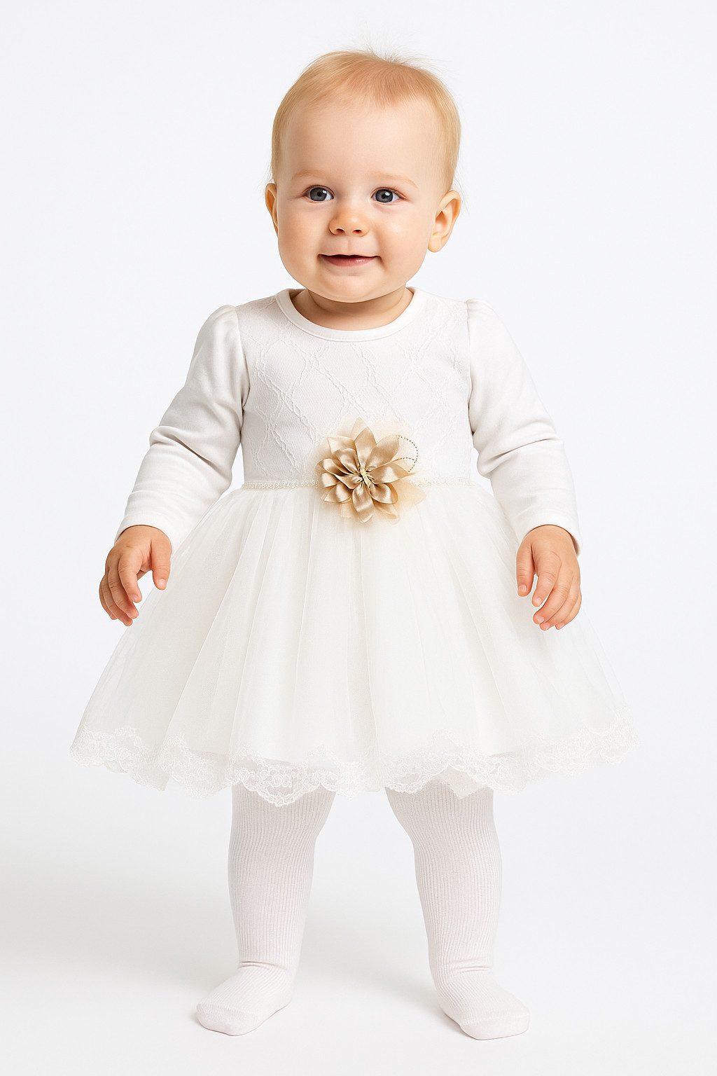 Dieses edle Kleid verzaubert mit seinem sanften Weiß und dem luftigen Tüllrock – perfekt für kleine Prinzessinnen. Das Oberteil aus weicher, hautfreundlicher Baumwolle sorgt für hohen Tragekomfort, während die feine Spitzenkante am Saum und die satinierte Blüte in Goldtönen an der Taille elegante Akzente setzen.