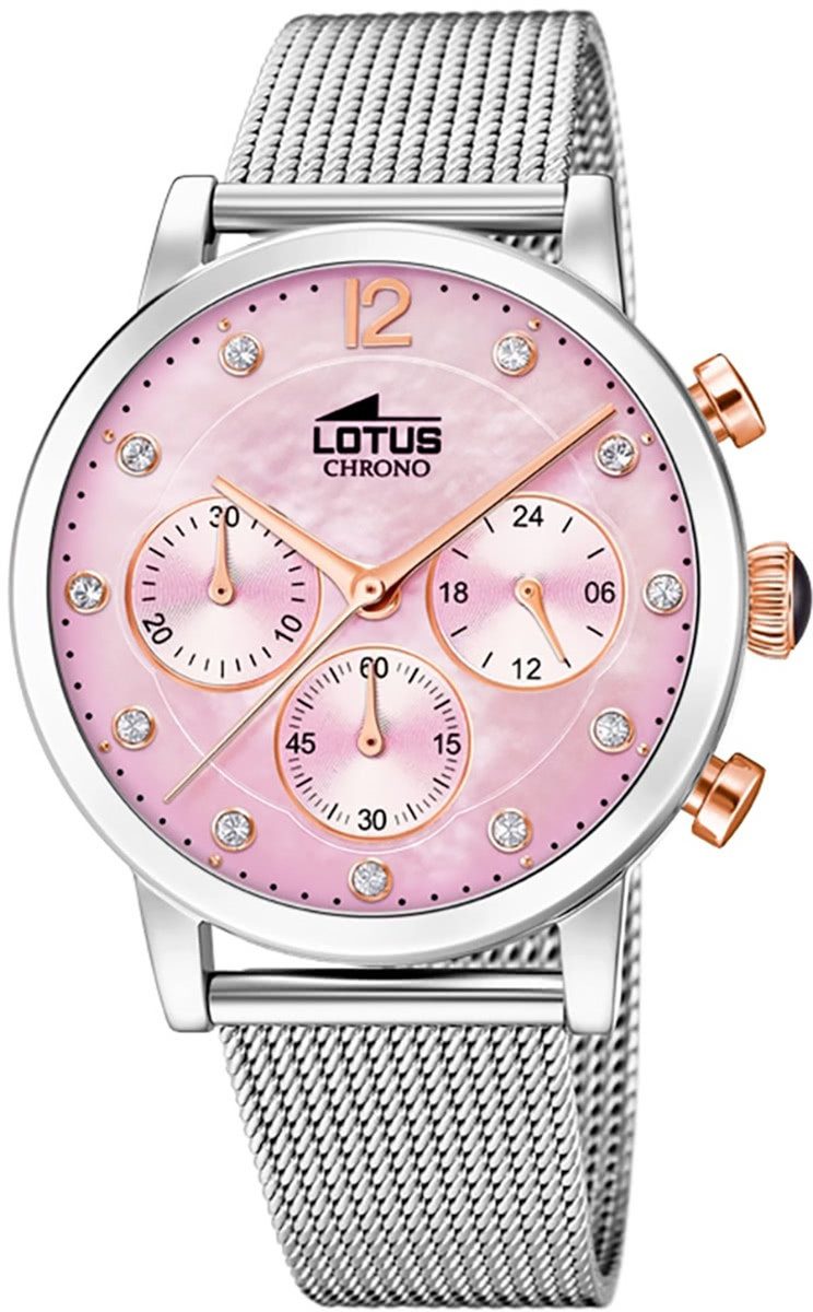 Die Fashion Uhr der Marke LOTUS hat ein schönes Armband aus Edelstahl in silber mit Faltschließe. Eine Uhr aus der Lotus Trendy Kollektion für Damen in der Gehäusefarbe silber mit Quarzwerk. Die Analoguhr mit Mineralglas hat ein Zifferblatt in der Farbe rosa. Die Form der Uhr ist rund und das Gehäuse ist mittel ca. 37mm.
