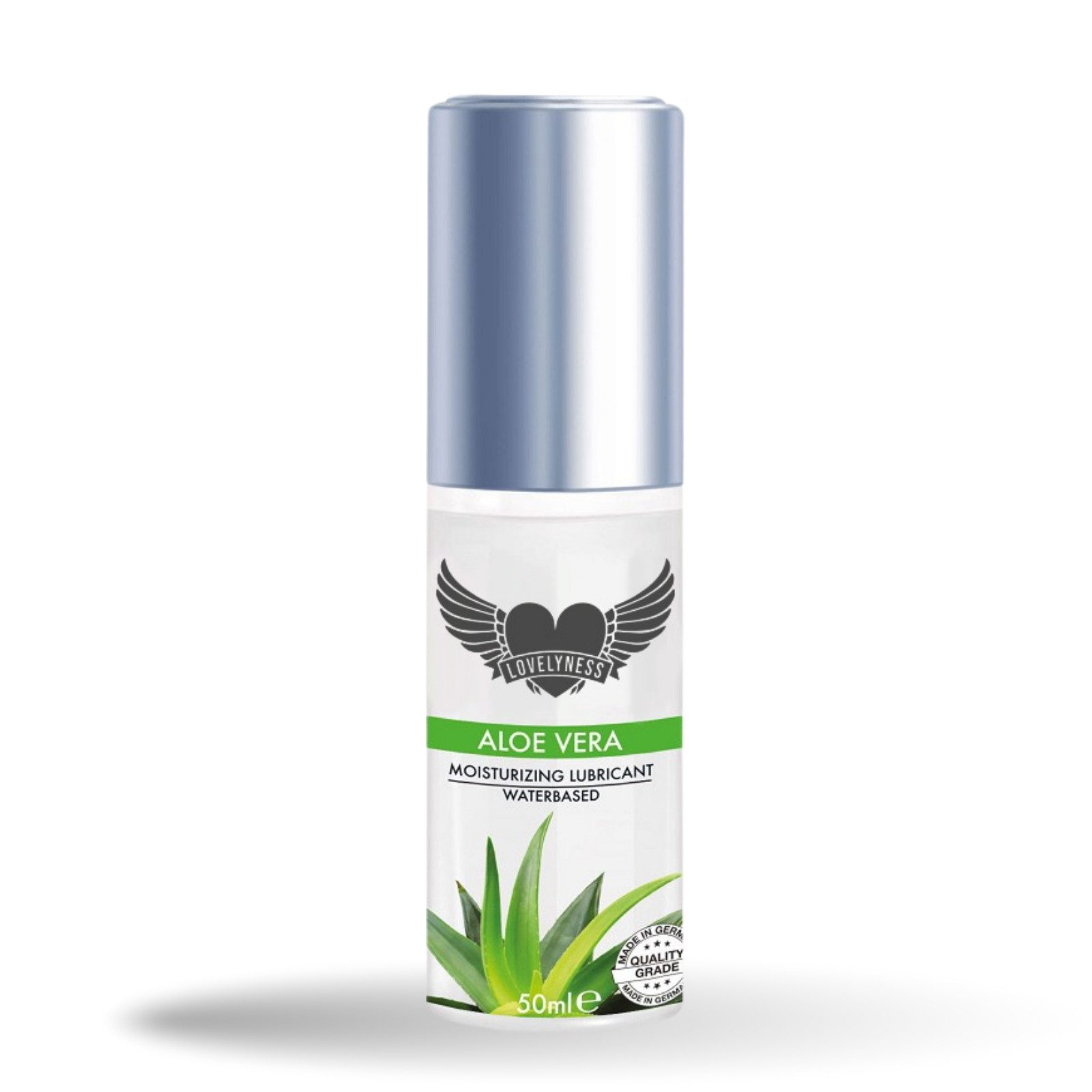 Lovelyness – Aloe Vera Gleitgel 50ml Das Lovelyness Gleitgel Aloe Vera ist ein Gleitmittel welches auf Wasserbasis besteht. Das Gleitgel ist speziell für Empfindliche und sensible Haut und Pflegt gleichzeitig da es Feuchtigkeit spendet. Das Gleitgel kann für den Vaginal und Analsex verwendet werden sowie in Kombination mit Sexspielzeug oder Kondomen. Tragen Sie die Gewünschte Menge an Gleitgel auf und wiederholen Sie den Fortgang so oft sie möchten. Die Gleitmittel von Lovelyness sind hautfreundlich und fettfrei, dadurch entstehen keine Flecken auf Kleidung und Bettwäsche.