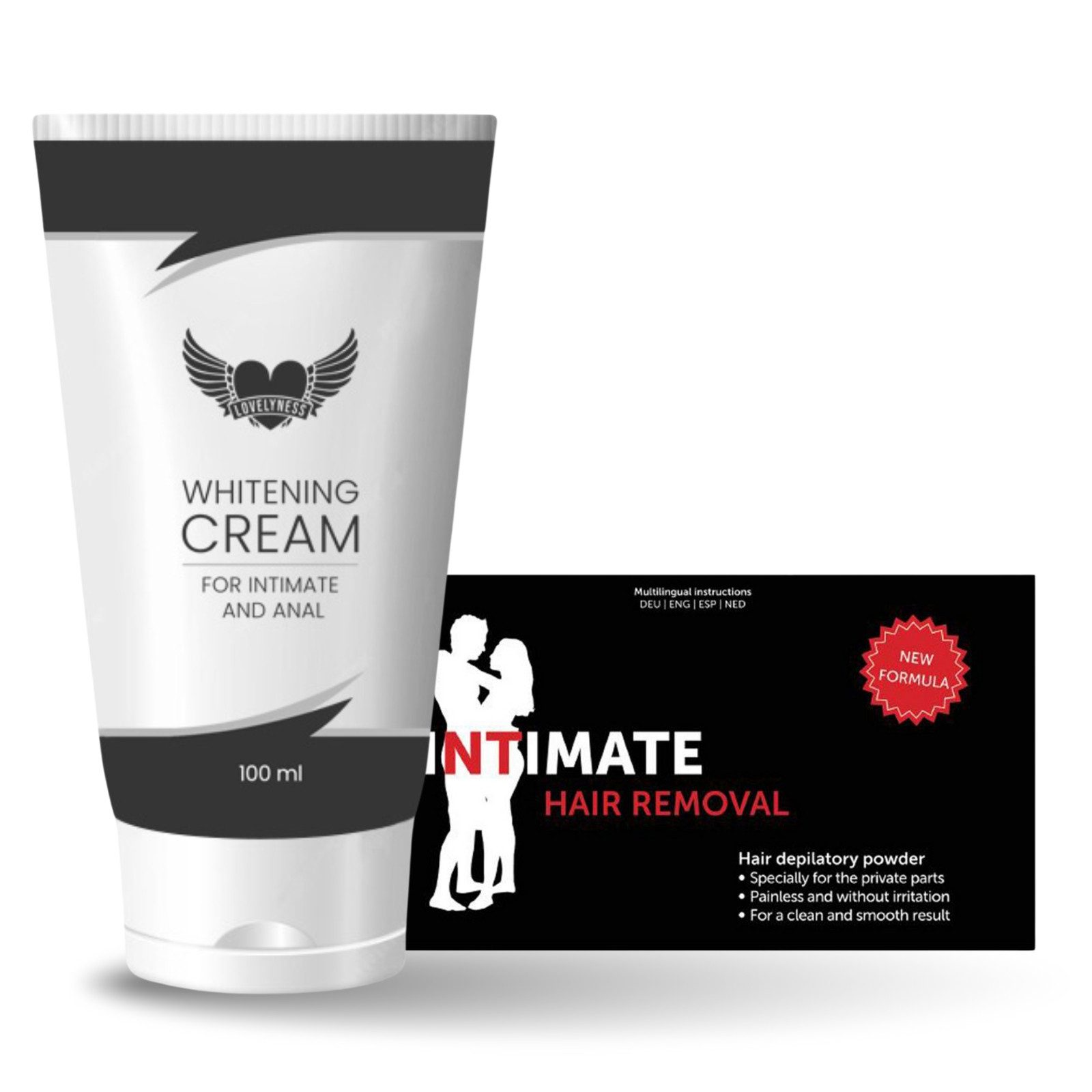 Lovelyness - Anal Bleaching Creme + Haarentferungspulver Dieses Intim Pflegeset sorgt für ein Gepflegten Intimbreich. Die Aufhellung des Anus ist ein aktueller Trend. Diese anale Whitening Creme ist eine Creme für empfindliche Haut, die speziell für das Weißen des Bereichs um den Anus herum entwickelt worden ist. Sie enthält ein spezielles Bleichmittel und fettende Inhaltsstoffe. Die Creme ist für empfindliche Haut geeignet. der Bereich um den Anus wird auf sanfte weise gebleicht und gleichzeitig gepflegt. Tragen sie etwas Creme auf den Zeigefinger auf und schmieren sie die Creme um den Anus herum. Lassen sie die Creme einige Zeit einwirken. Intimate Hair Removal ist ein Enthaarungspulver, das sich für die Enthaarung des Intimbereichs eignet. Rühren Sie das Pulver in warmes Wasser ein, tragen Sie es auf die Haut auf, dort wo Haare entfernt werden sollen, und warten Sie 7-10 Minuten. Spülen Sie die Paste anschließend mit lauwarmem Wasser ab. Speziell entwickelt für: Bikinizone, Gesäßrille, Damm/Schambereich und männliche Genitalien. Geeignet für Männer und Frauen! Enthaarungspulver • Für den Intimbereich • Schmerzfrei und ohne Hautreizung • Für ein glattes und sauberes Ergebnis ACHTUNG: Testen Sie den Unterarm IMMER vor dem Gebrauch! Im Falle von Überempfindlichkeit, Reizung oder Rötung, verwenden Sie die Enthaarungscreme überhaupt nicht.