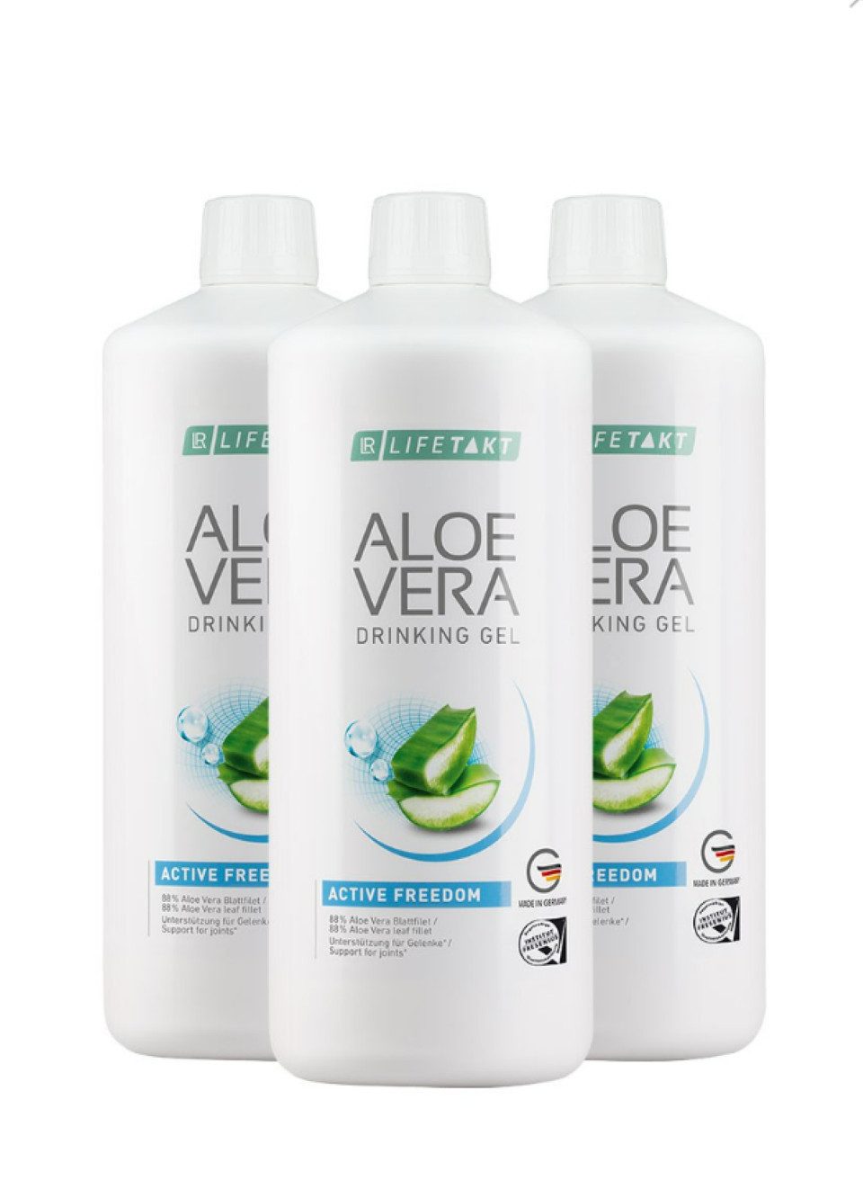 Aloe Vera Drinking Gel Active Freedom 3er Set Der 3-fach-Kick für deinen Bewegungsapparat + BEWEGLICHKEIT: Der Erhalt von Knorpel wird unterstützt1 + KRAFT: Der Erhalt von Knochen wird unterstützt2 + ENERGIE: Der Energiestoffwechsel wird unterstützt und Müdigkeit reduziert3,5 Das Aloe Vera Drinking Gel Active Freedom mit fruchtigem Orangengeschmack ist die beste Unterstützung für einen normalen Bewegungsapparat. Um die Gelenke zu erhalten, ist es förderlich, sich regelmäßig zu bewegen und den Körper mit den wichtigsten Nährstoffen zu versorgen. Das Aloe Vera Drinking Gel Active Freedom bietet eine optimale Wirkstoffkombination zur Unterstützung des Bewegungsapparates. Das Aloe Vera Blattgel reichert LR mit den Vitaminen C und E an. Vitamin C unterstützt die Knochen- und Knorpelfunktion – dein Bewegungsapparat wird gestärkt.1 Deine Gelenke werden dir regelmäßige Bewegung in Kombination mit dem Verzehr des Aloe Vera Drinking Gels Active Freedom danken! NATÜRLICH: 88 % Aloe Vera-Blattgel AKTIV: Mit Vitamin E, Kollagen, Glucosaminsulfat, Chondroitinsulfat und dem Aktiv-Wirkstoff Vitamin C1 LECKER: Mit anregendem, natürlichem Orangengeschmack Die Basis: das Multitalent Aloe Vera Bereits seit Jahrtausenden wird die Aloe-Vera-Pflanze für ihrer einzigartige Zusammensetzung an Inhaltsstoffen geschätzt. Das im Inneren befindliche Blattfilet besitzt über 200 Vitalstoffe. Es stärkt zudem die Bioverfügbarkeit wichtiger Nährstoffe. So werden Vitamine besser vom Körper aufgenommen.4,5 + DEIN ENERGIEVERSORGER: Die essentiellen Wirkstoffe im Aloe Vera-Gel sorgen für mehr Energie und Vitalität.3 Die Bioverfügbarkeit der Wirkstoffe wird erhöht. + DEIN IMMUNSCHUTZ: Das Aloe Vera-Gel stärkt das Immunsystem und hält deine körpereigenen Prozesse in Balance.4 + DEIN REGENERIERER: Das Aloe Vera Gel unterstützt Aufbau- und Regenerationsprozesse.5 + DEIN STOFFWECHSEL-PROFI: Das Aloe Vera-Gel regt den Stoffwechsel an.3 Für unserer Aloe Vera Drinking Gele benutzen wir ausschließlich das reine Blattfilet der Aloe Barbadensis Miller. Dieses befindet sich im Inneren des Blattes der Aloe-Vera-Pflanze. 1Vitamin C trägt zu einer normalen Kollagenbildung für eine normale Knorpelfunktion bei. 2Vitamin C trägt zu einer normalen Kollagenbildung für eine normale Funktion der Knochen bei. 3Das in den LR Aloe Vera Drinking Gelen enthaltene Vitamin C trägt zu einem normalen Energiestoffwechsel bei. 4Das in den LR Aloe Vera Drinking Gelen enthaltene Vitamin C trägt zu einer normalen Funktion des Immunsystems bei. 5Das in den LR Aloe Vera Drinking Gelen enthaltene Vitamin C trägt zur Verringerung von Müdigkeit und Ermüdung bei und trägt zur Regeneration der reduzierten Form von Vitamin E bei. Aloe Vera Drinking Gel Traditionell mit Honig steht auf der Kölner Liste®. Die Kölner Liste® führt Nahrungsergänzungsmittel mit minimiertem Dopingrisiko, die von einem in der NEM-Analytik auf Dopingsubstanzen weltweit führenden Labor auf anabole Steroide und Stimulantien getestet wurden. Все weiteren Infos gibt es auf der Internetseite der Kölner Liste® unter www.koelnerliste.com.