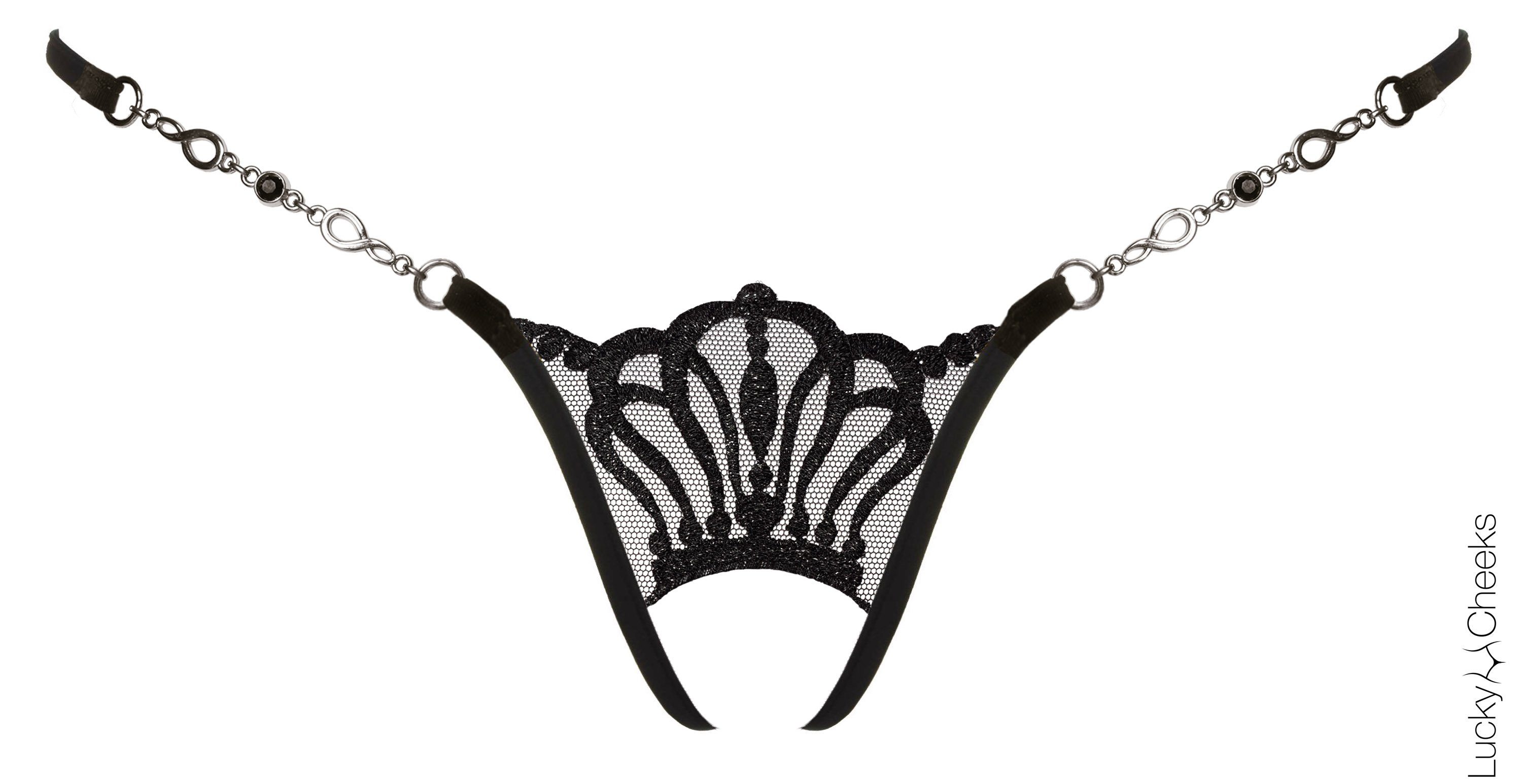 Die elastischen Hüftbänder optimieren den Tragekomfort und die edlen Schmuckkettchen aus Zamak mit glänzenden, schwarzen Swarovski Steinchen vervollständigen das luxuriöse Dessous.