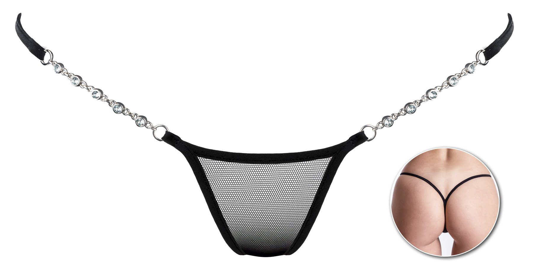 Das Highlight dieses erotischen Dessous sind die Schmuckkettchen aus Zamak mit weiß - glänzenden Swarovski Kristallen.