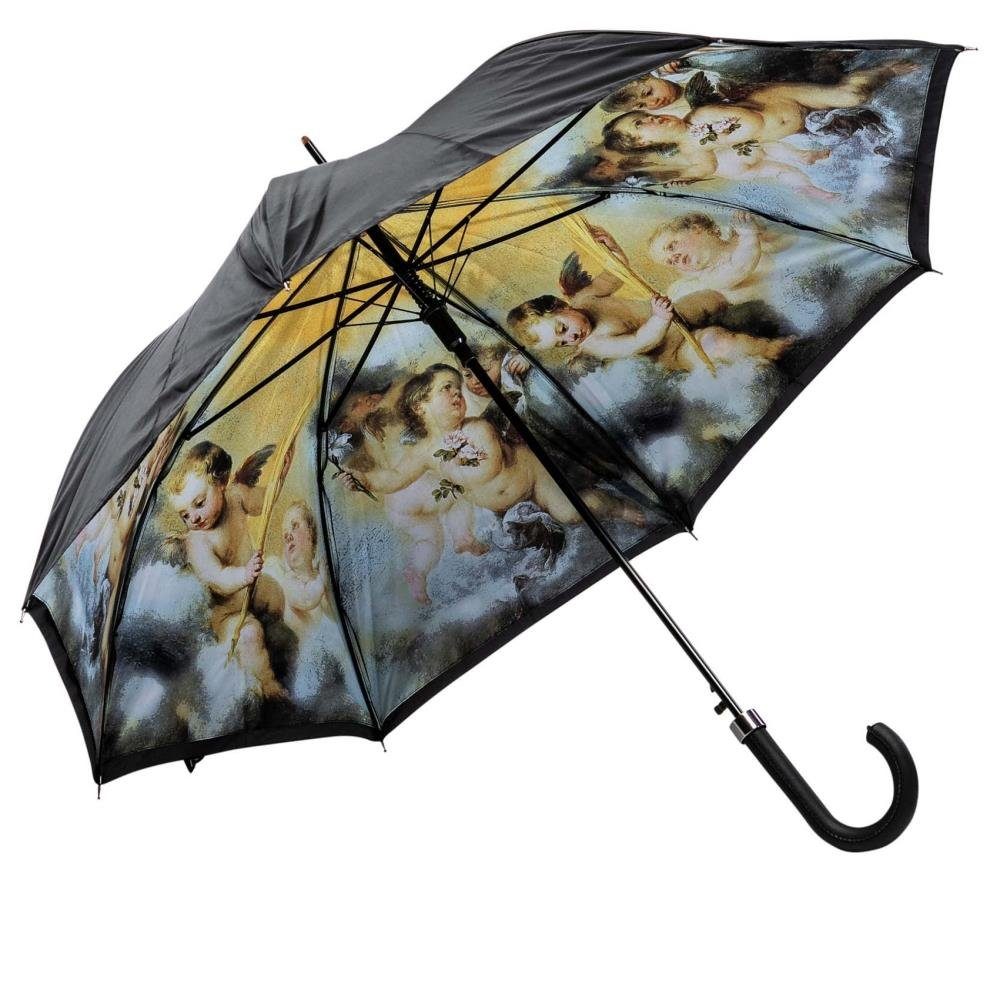 Lassen Sie sich begeistern von diesem Regenschirm mit seinem tollen Engelmotiv. Außen klassisches Schwarz - innen lassen leuchtende, helle Farben diesen Schirm strahlen. Sanftes gelb wechselt sich ab mit weiß, zartem hellblau und grau. Kleine Engel sitzen zwischen den Wolken und schmiegen sich aneinander. Dieses Motiv ist einfach bezaubernd und mit viel Liebe zum Detail gearbeitet. Ein wahres Kunstwerk!