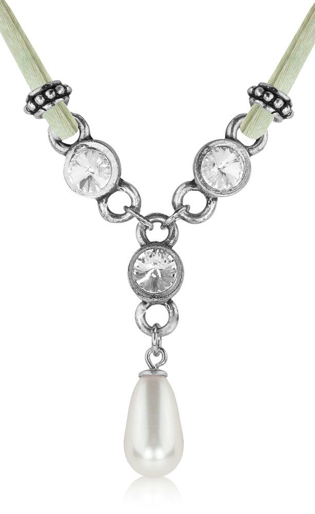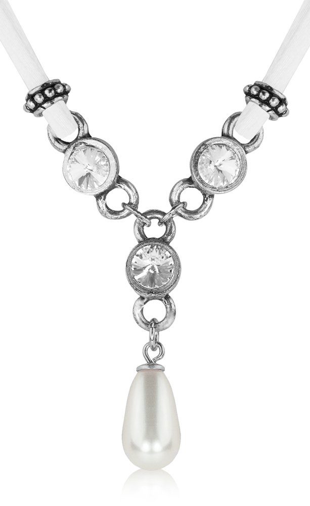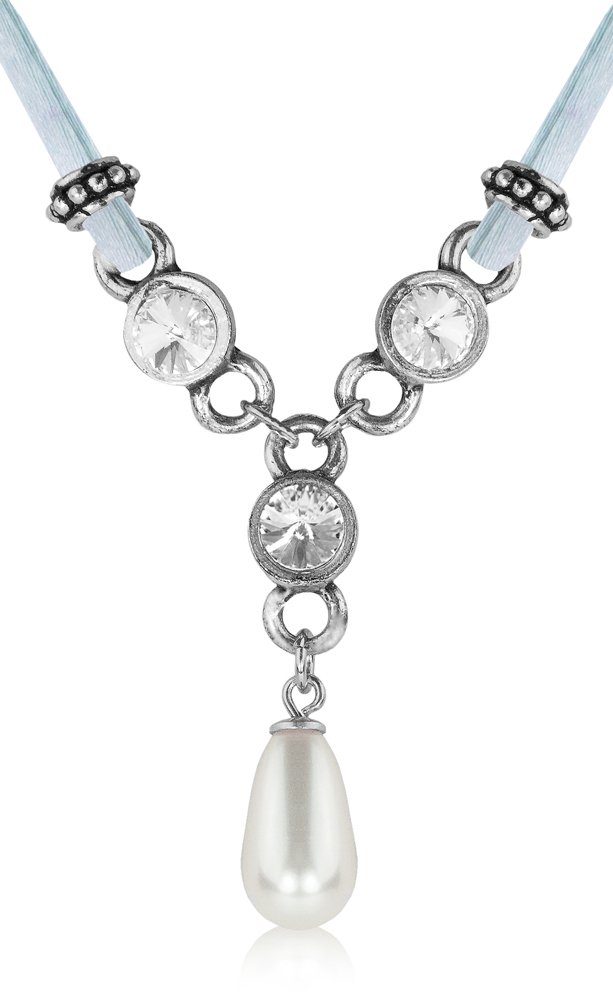Durch das satinähnlich glänzende Kettenband ist die Halskette besonders angenehm zu tragen. Zu einem Y angeordnet funkeln dem Betrachter drei traumhaft schöne Swarovski Steine entgegen. Die tropfenförmige Perle rundet das harmonische Bild ab und macht das Collier zu etwas ganz Besonderem. Geschlossen wird die Kette mit einem Karabinerhaken. Mit einem Verlängerungskettchen bestimmen Sie die gewünschte Длина.
