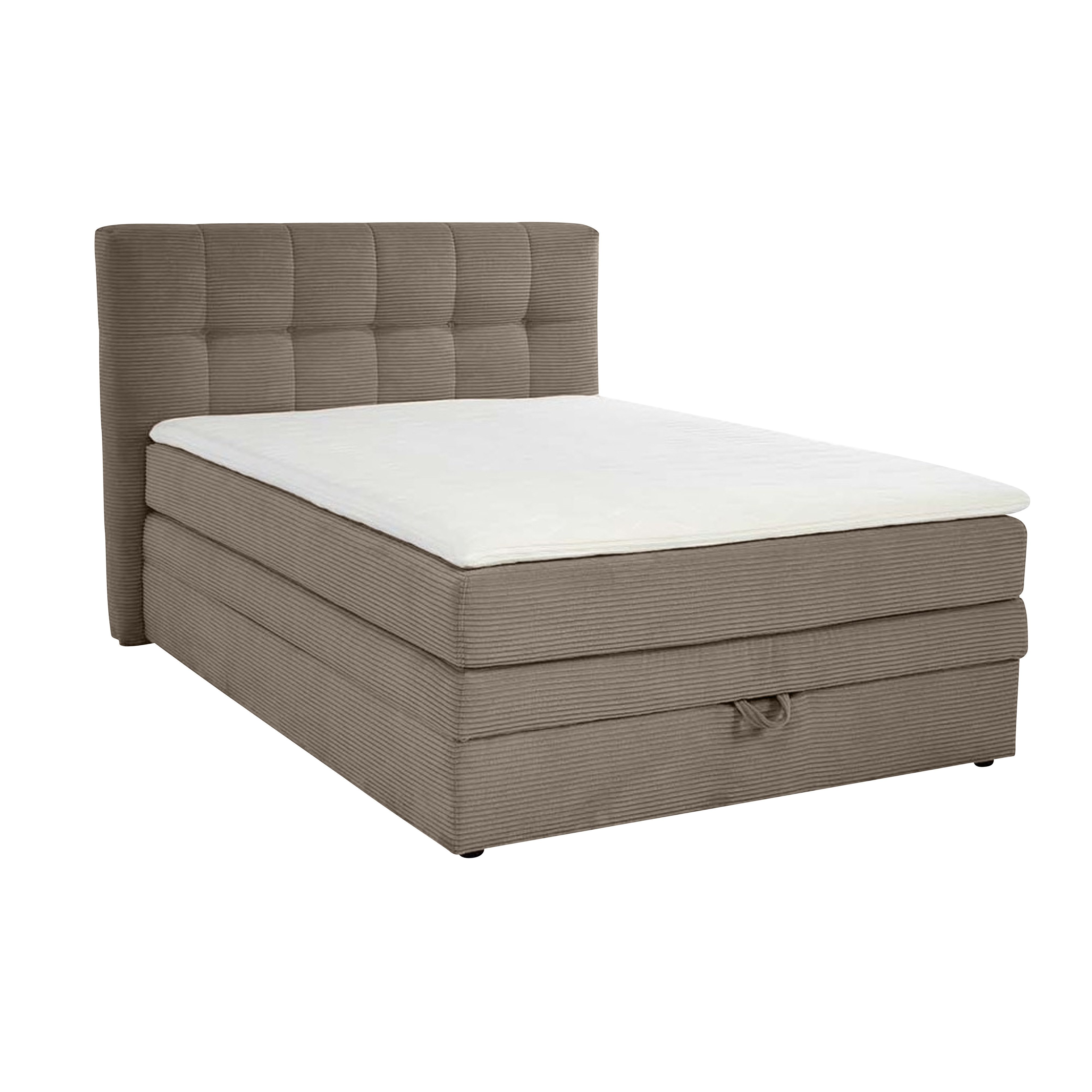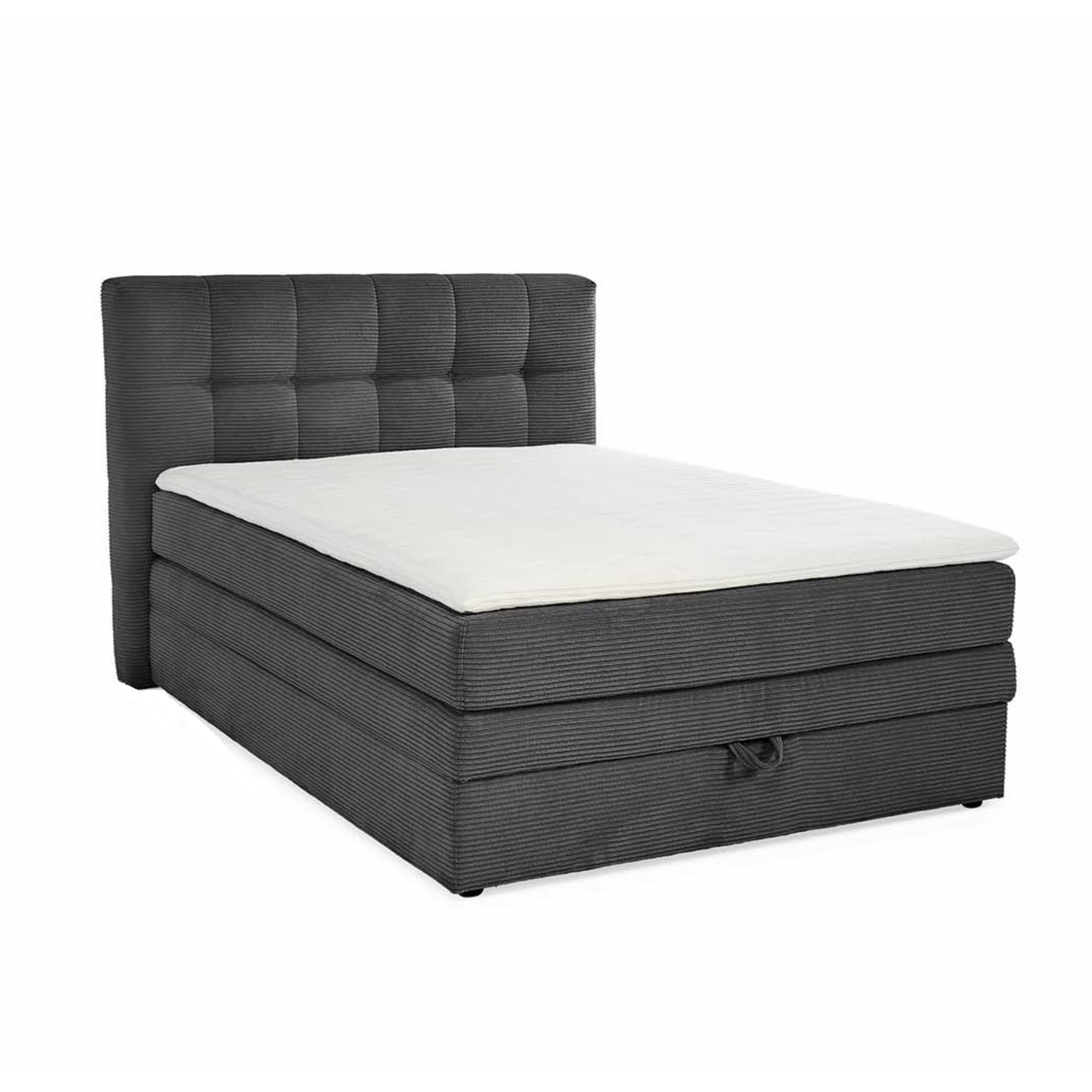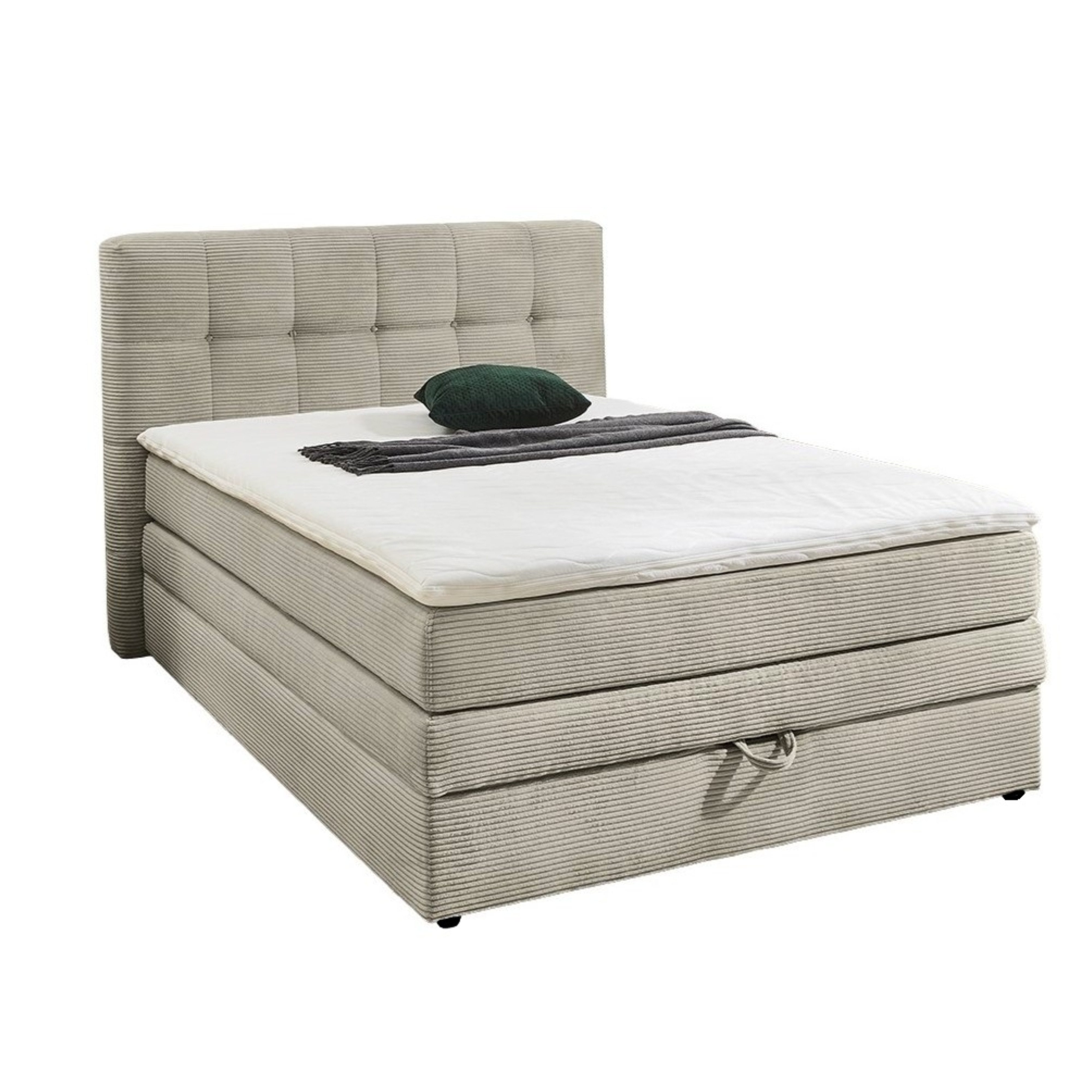Wissenswertes | Dieses moderne Boxspringbett bietet Ihnen einen hervorragenden Liege- und Schlafkomfort durch die exzellente Polsterung mit Bonell-Federkern im Unterbau und einer 7-Zonen-Tonnentaschen-Federkernmatratze in Härtegrad 3 mittelfest, bis 120 kg belastbar. Durch den Kaltschaumtopper verstärkt sich nochmals das traumhafte Liegegefühl! Die Box beinhaltet einen belüfteten Bettkasten, der sich mit Unterstützung von Gasdruckfedern sehr leicht öffnen lässt und viel Stauraum bietet. Das Trendbett hat einen modischen Cord-Bezug und ist dabei trotzdem strapazierfähig und robust. |