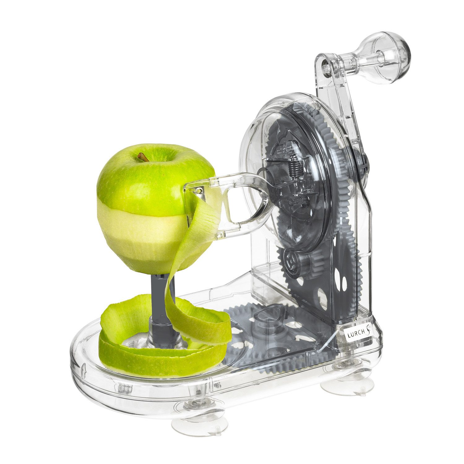 Der Lurch Apfelschäler ist auch optisch eine Perfektion. Das transparente, stylische Gehäuse aus hochwertigem Kunststoff gewährt einen Einblick auf die interessante Zahnradtechnik im Inneren. Zusätzlich ist der Apfelschäler mit Saugfüßen ausgestattet, die für einen sicheren Stand sorgen.
