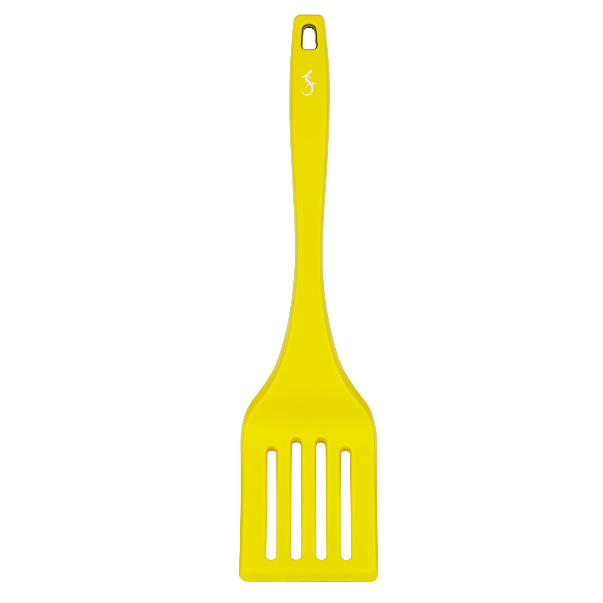 Dank seiner abgeschrägten Kante lassen sich selbst Eierspeisen rückstandslos von Pfannen- und Topfböden lösen. Die praktischen Schlitze in der Fläche sorgen zudem für ein sauberes Ablaufen von Bratfett.