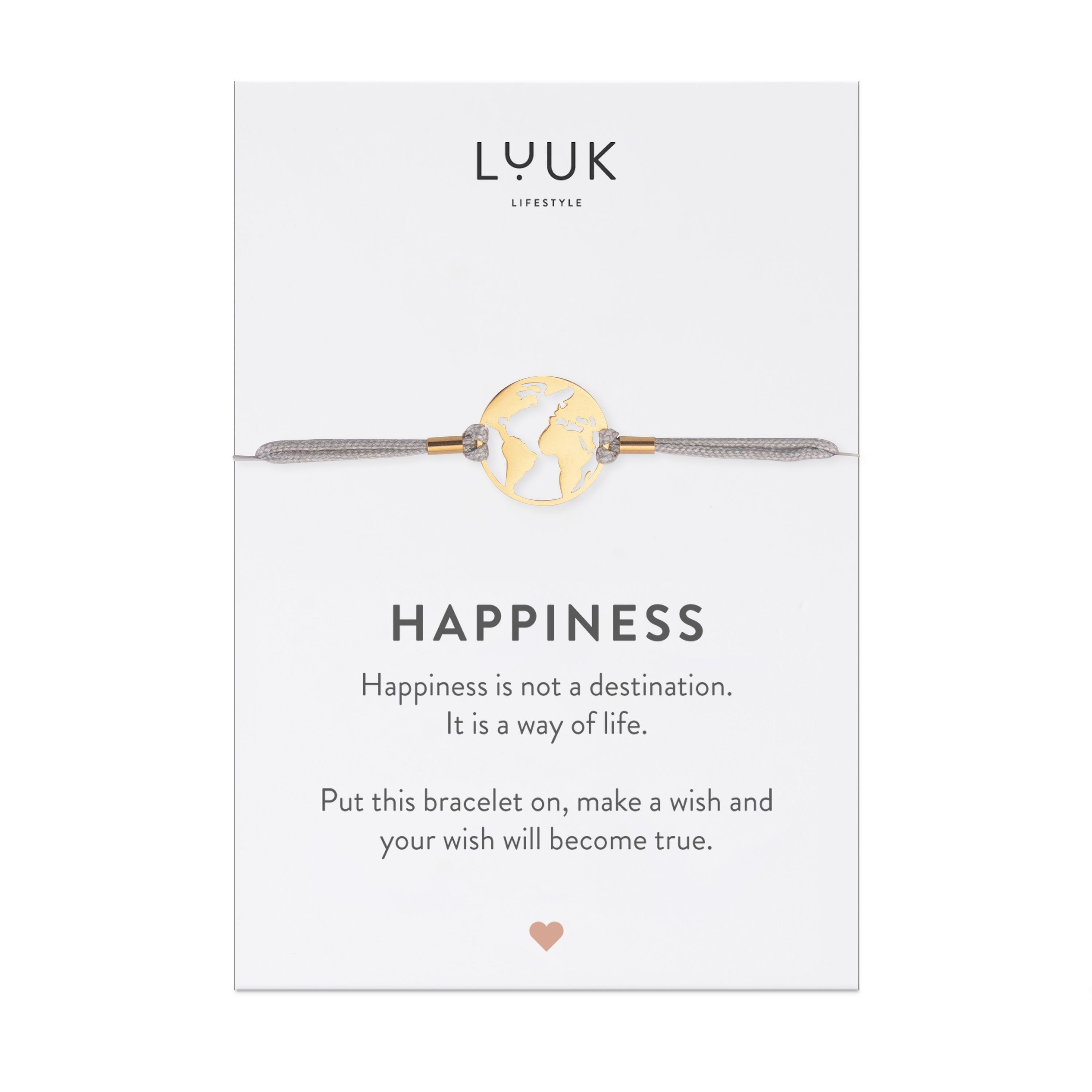 Filigranes Armband in schlichtem Design mit Weltkarten Anhänger. Verfügbar in den Farben Gold und Silber inklusive HAPPINESS Spruchkarte. Das Armkettchen wirkt feminin, stilvoll und ist vielseitig kombinierbar.