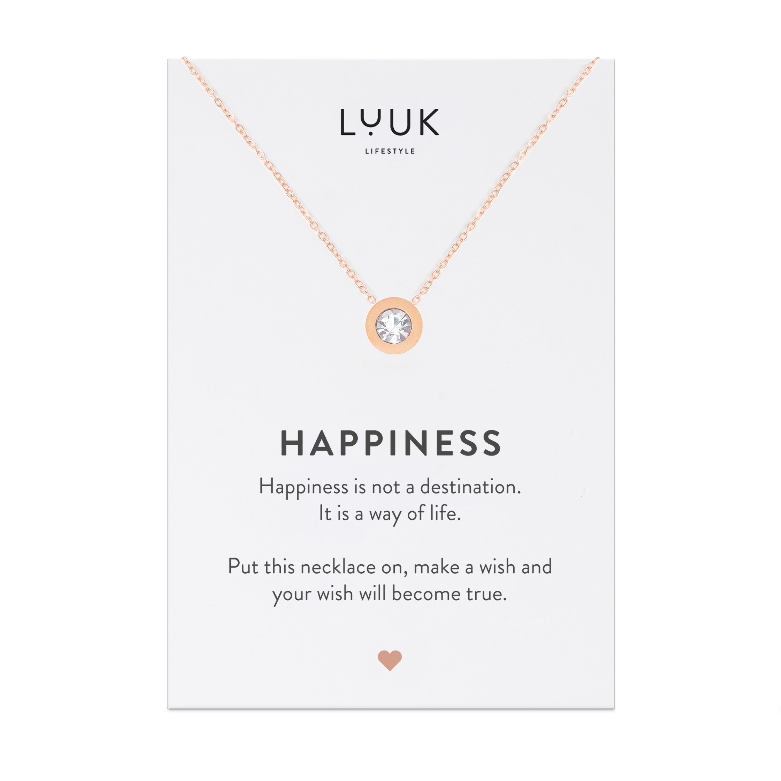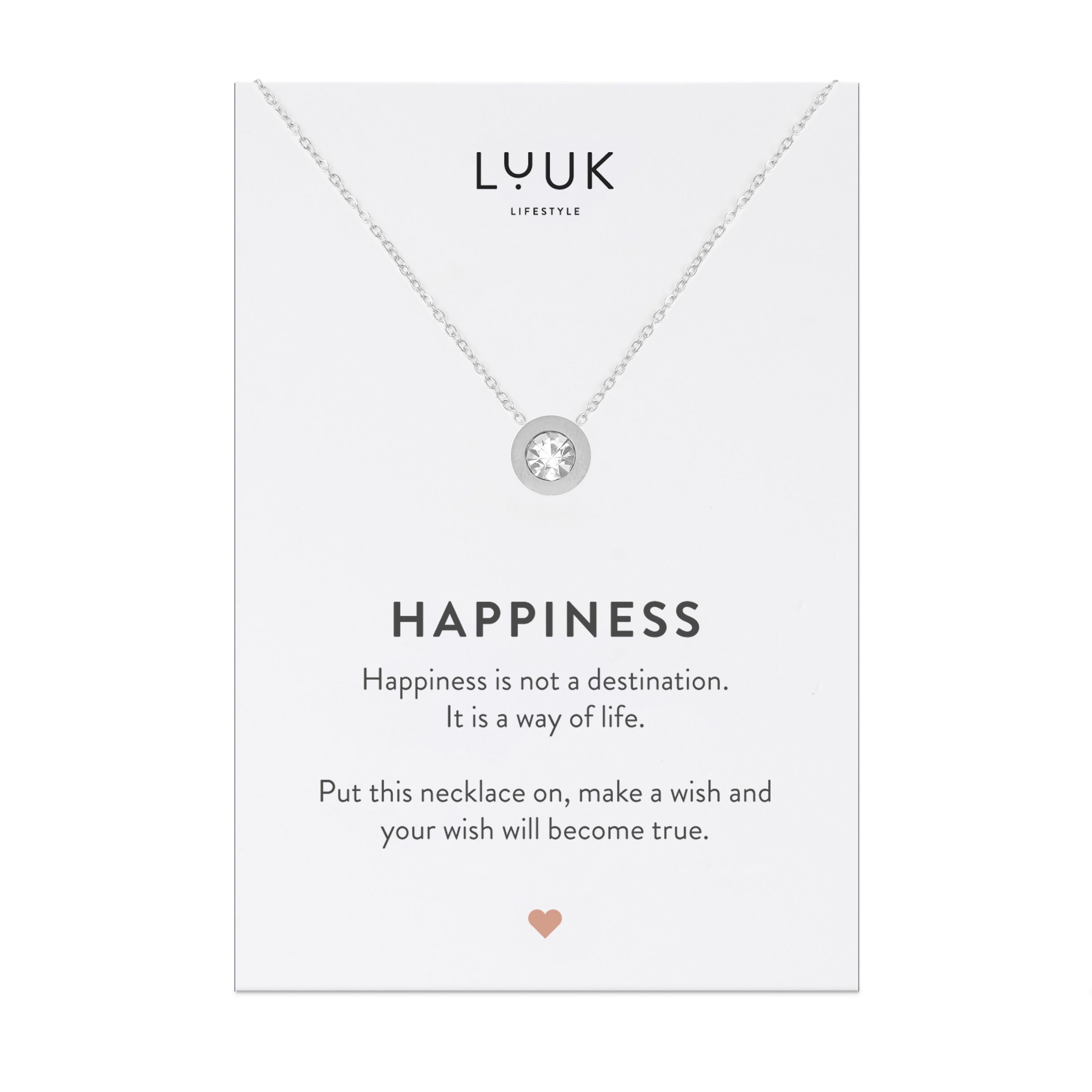Filigrane Kette in schlichtem Design mit Strassstein Anhänger. Verfügbar in den Farben Gold, Silber und Roségold inklusive HAPPINESS Spruchkarte. Die Halskette wirkt feminin, stilvoll und ist vielseitig kombinierbar.