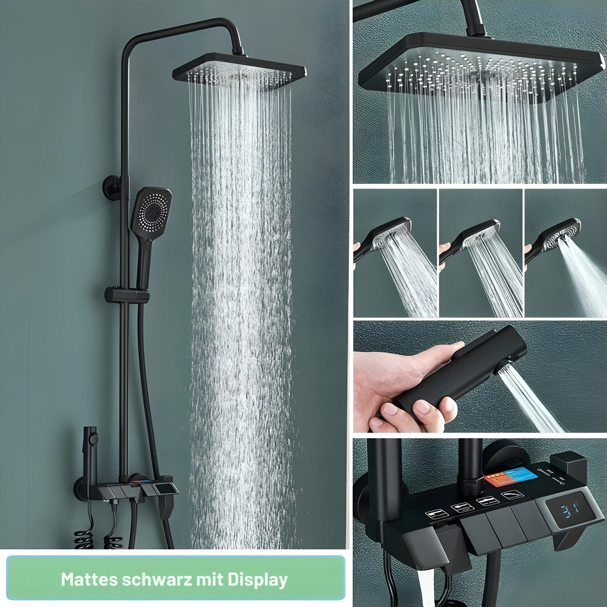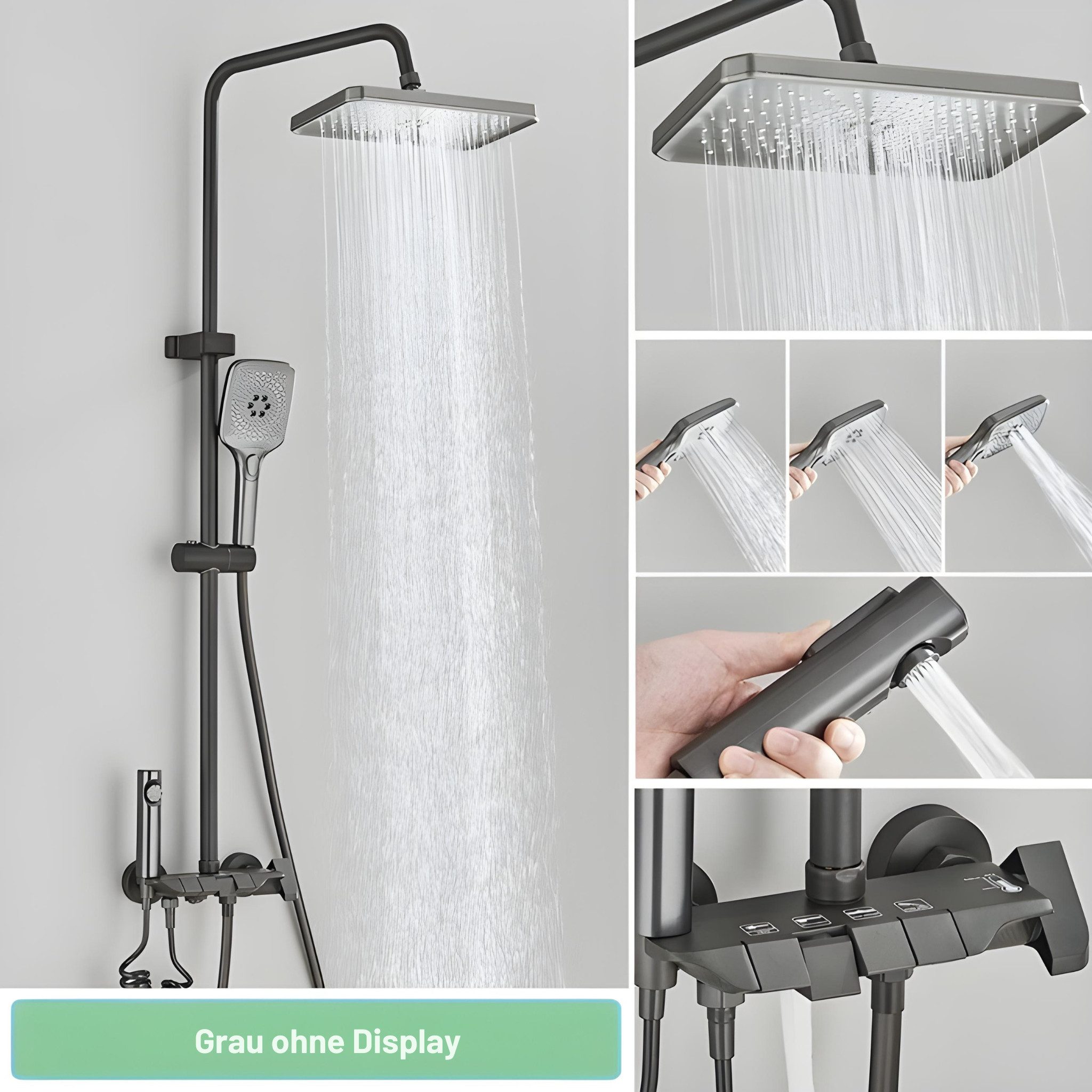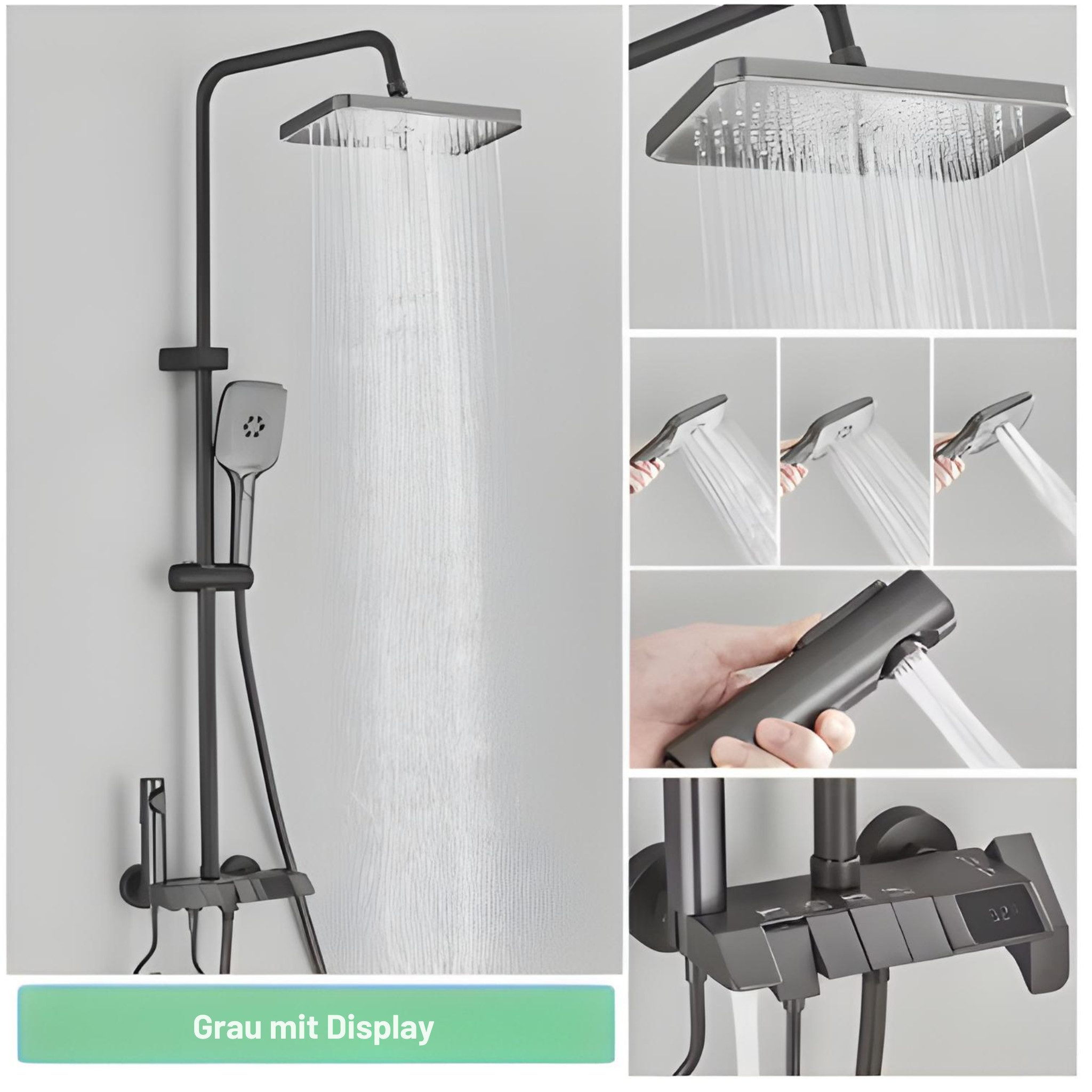 Dieses Duschsystem bietet eine innovative Lösung für Ihr Badezimmer. Die digitale Temperaturanzeige wird durch Wasserkraft betrieben, sodass keine Stromquelle oder Batterien erforderlich sind. Das elegante Design in Schwarz und Grau kombiniert modernes Aussehen mit hoher Funktionalität. Die integrierte Mischbatterie sorgt für eine konstante Wassertemperatur, während die großflächige Regendusche für ein luxuriöses Duscherlebnis sorgt.