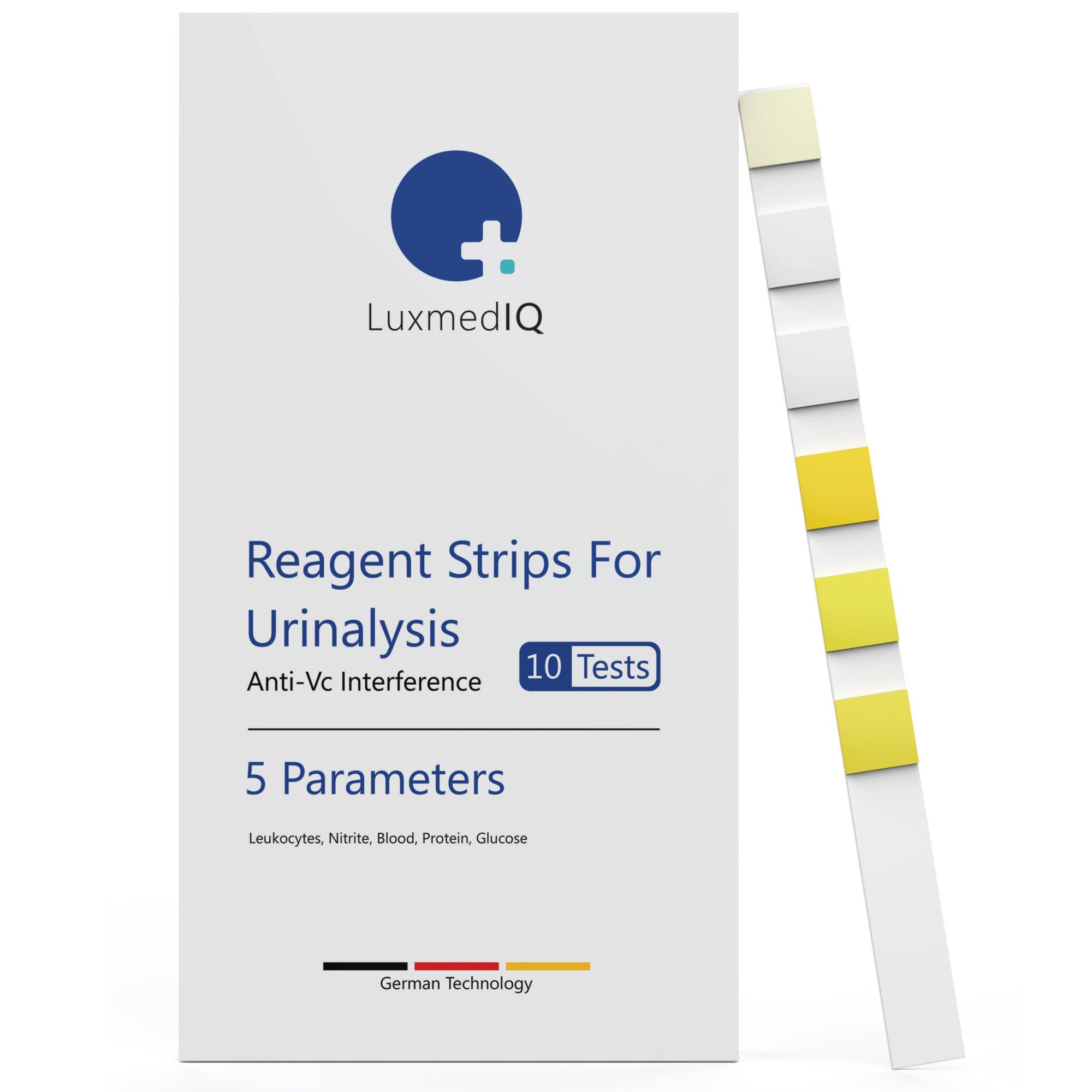 Anwendung | Nehmen Sie einen Teststreifen aus dem Beutel und verwenden Sie ihn sofort. Tauchen Sie die Reagenzbereiche vollständig in frischen Urin ein und ziehen Sie den Streifen direkt wieder heraus. Streifen Sie die Seite des Streifens am Rand des Urinbehälters ab und tupfen Sie die Längskante auf ein Papiertuch, um überschüssigen Urin zu entfernen und eine Kontamination benachbarter Reagenzbereiche zu vermeiden. Nach 60 Sekunden vergleichen Sie die Reagenzbereiche mit der Farbkarte auf der Verpackung. Achten Sie dabei unbedingt auf die korrekte Ablesezeit für exakte Ergebnisse. |