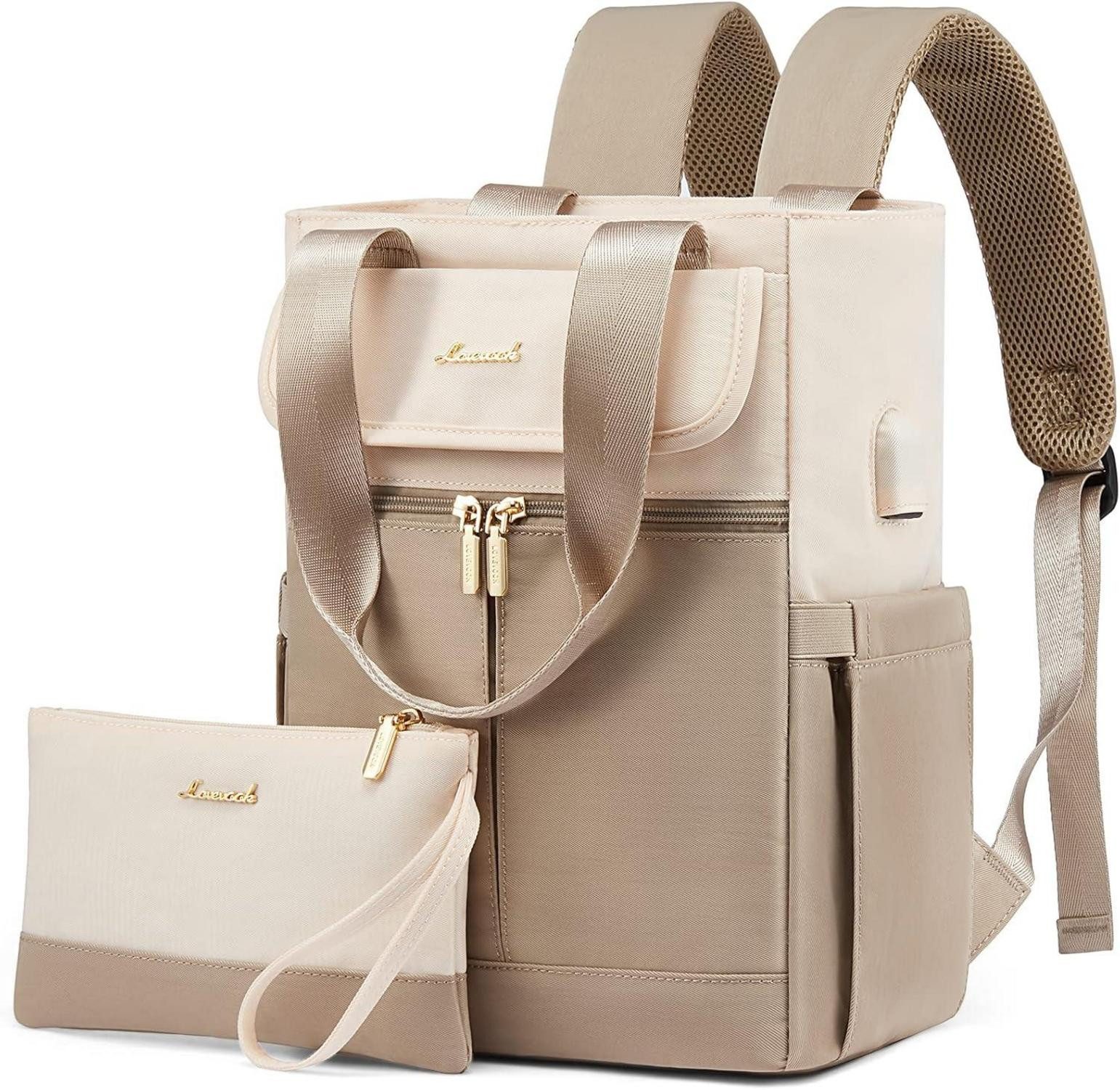 Dieser elegante Rucksack wird mit einer zusätzlichen Clutch geliefert, die 2 Fächer bietet - eins für Kleinteile wie Kosmetik und Schlüssel und eins mit Reißverschluss für Kleingeld oder Karten. Mit 3 weiteren Fächern und Taschen verfügt der Rucksack über ausreichend Stauraum. Ein separates gepolstertes Fach bietet Platz für ein 12,9 Zoll iPad und das Hauptfach kann einen 13,3 Zoll Laptop aufnehmen. Darüber hinaus gibt es elastische Getränkehalter auf beiden Seiten für größere Tassen.