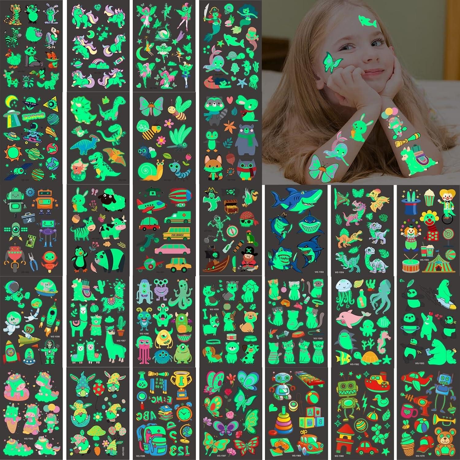 Leuchtende Klebetattoos Kinder: Kinder werden durch die süßen leuchtenden Tattoos attraktiv sein und der Party mehr Spaß verleihen! Es ist zu beachten, dass die Tattoos einige Minuten Lichtaktivierung benötigen, bevor sie im Dunkeln leuchten.