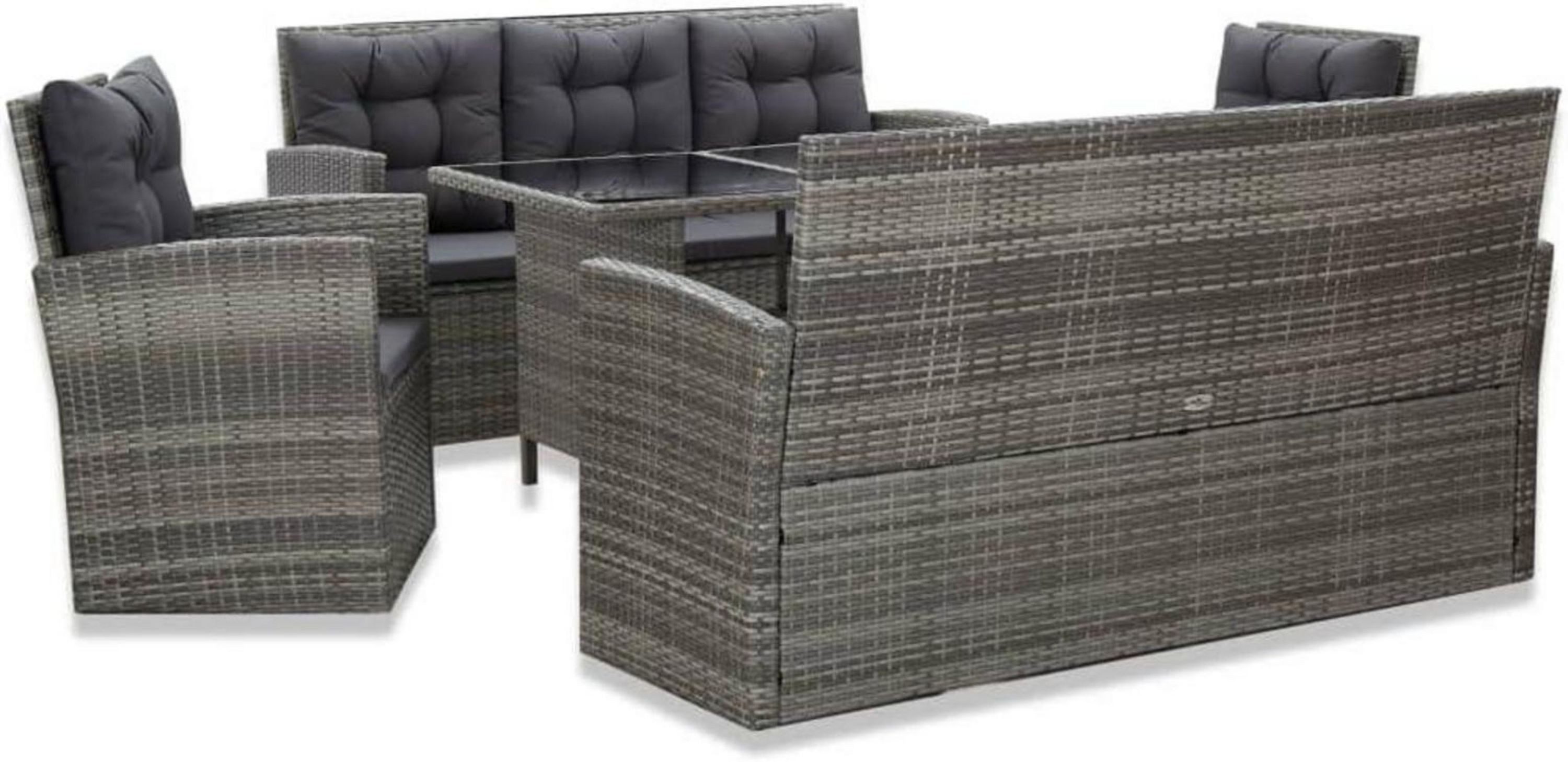 Hinweis: Wir empfehlen, das Set bei Regen, Schnee und Frost abzudecken, um eine lange Lebensdauer zu gewährleisten. Die pflegeleichten Polyesterbezüge können auch abgenommen und gewaschen werden. Das Set ist kinderleicht zu montieren. Da die Konstruktion jedoch auch leicht ist, lassen sich alle Artikel spielend umher bewegen. Dieses Set wird auch samt äußerst bequemen, dick gepolsterten Sitz- und Rückenkissen geliefert, die für den höchsten Komfort sorgen. Dank des wasserfesten PE-Rattans ist die Sofagarnitur pflegeleicht, strapazierfähig und für den täglichen Gebrauch im Freien geeignet. Die pulverbeschichteten Stahlrahmen machen das Set stabil und langlebig. Diese Poly Rattan Sofagarnitur, bestehend aus zwei 3-Sitzer-Sofas, 2 Sesseln, 1 Tisch und 16 Kissen, bietet einen stilvollen Sitzbereich für Ihren Garten oder Ihre Terrasse.