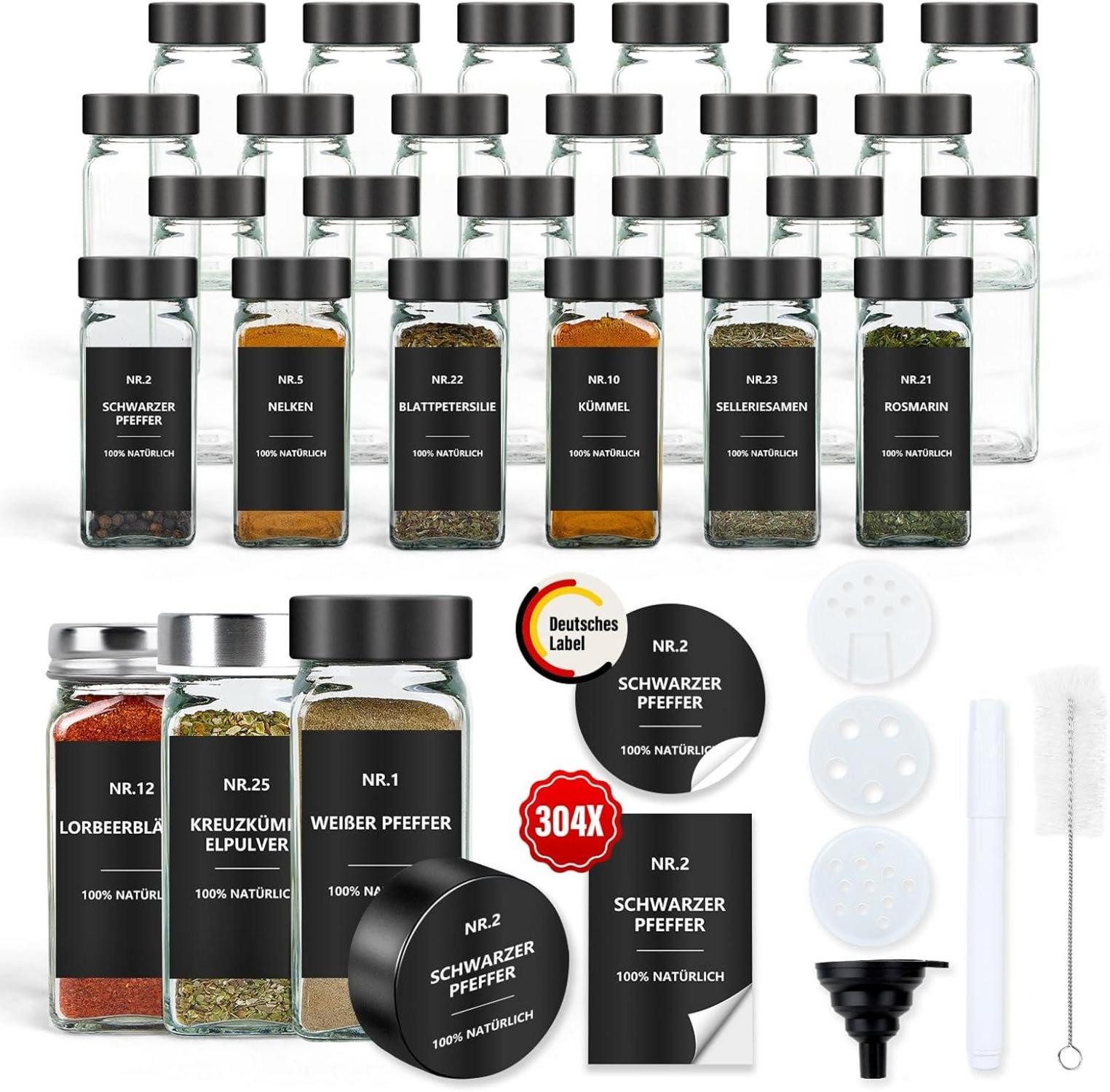 RISIKOFREIE INVESTITION: Wir sind sicher, dass Sie unsere Gewürzgläser lieben werden. Sollten die Produkte Qualitätsmängel aufweisen, kontaktieren Sie uns bitte per E-Mail, und wir bieten Ihnen eine 100% zufriedenstellende Lösung an. ORDNUNG UND STIL IN DER KÜCHE: Präsentieren Sie Ihre Gewürze einheitlich und stilvoll in unserem 24er Set an Gläsern für Gewürze. Die Vielseitigkeit in Ihrer Küche sorgt für eine hochwertige Ästhetik und bewahrt Frische und Qualität. PLATZSPAREND: Unsere Gewürzgläser haben ein quadratisches Design, das maximalen Platz auf Ihrem Gewürzorganizer, in Schubladen und auf Ihrer Werkbank spart. So müssen Sie sich keine Gedanken mehr über die Gewürzaufbewahrung machen. BPA-FREE, HOCHWERTIGE MATERIALIEN: Die Gewürzbehälter bestehen aus bleifreiem, dickwandigem Glas und umweltfreundlichem, lebensmittelechtem Kunststoff. Spülmaschinenfest und mottenfrei. Die luftdichten Deckel halten Feuchtigkeit und Luft fern. GEWÜRZGLÄSER SET: Unser Gewürzdosen-Set enthält 24 x 120 ml hochwertige eckige Gewürzstreuer, 62 leere wasserfeste Etiketten, 240 deutsche Etiketten, 30 Streueinsätze, Trichter, Etikettenstift, Reinigungsbürste und unzerbrechliche Verpackung.