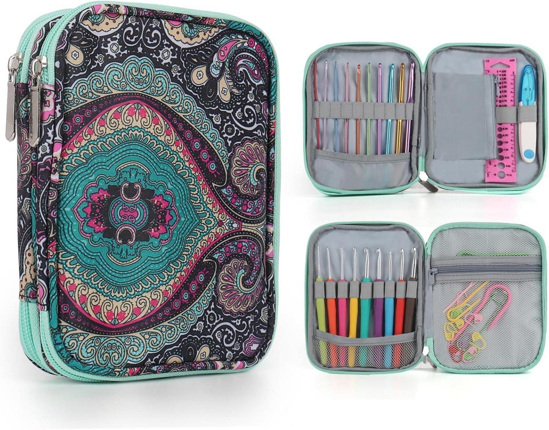 Dieser niedliche Häkel Organizer ist ein Muss für Strickbegeisterte und Häkelanfänger gleichermaßen und das perfekte Geschenk für Häkelbegeisterte. Ideal für Reisen mit Häkelprojekten. Ein perfektes Geschenk für Mütter, Ehefrauen, Freundinnen, Häkelliebhaberinnen und Strickanfängerinnen. Im Paket ist nur ein leerer Häkelorganizer enthalten, Häkelnadeln und andere Gegenstände sind nicht enthalten. Die leeren Abmessungen des Häkelnadel Tasche mit Reißverschluss sind 18 x 15 x 3,6 cm. Er hat die richtige Размер und nimmt nicht zu viel Platz in Anspruch, sodass er problemlos in Ihren Rucksack, Koffer oder Ihre Tasche passt. Wenn Sie einige Häkelnadeln mit auf Reisen nehmen möchten, ist diese tragbare Häkelzubehörbox eine gute Wahl! Perfekt für alle Ihre Häkelarbeiten, wenn Sie unterwegs sind. Außerdem ist dieses Häkelbox perfekt für den Gebrauch zu Hause. Dank der unterteilten Aufbewahrungsfächer ist das gesamte Häkelzubehör übersichtlich und leicht zugänglich. Eine große Tasche in voller Размер bietet Platz für austauschbare Nadeln, Maßband, Reihenzähler, Schere, Nadeltasche und mehr. Eine kleinere Reißverschlusstasche bietet Platz für Maschenmarkierer und lose Применитьstellungsnadeln. Der Häkel-Organizer sorgt für Ordnung bei Häkelnadeln und anderen Kleinigkeiten. Der 1. Reißverschlussbereich hat 9 große elastische Schlaufen, um mehr Platz für Häkelnadeln mit dickem Griff zu bieten. Das 2. Reißverschlussfach hat 10 kleine elastische Schlaufen zur Aufbewahrung normaler Häkelnadeln. Jede Häkelnadel hat ihren eigenen Schlitz, sodass Sie die Размер der Häkelnadel auf einen Blick erkennen können und die Handhabung erleichtert wird. Die Tasche am Boden verhindert, dass die Häkelnadeln beim Öffnen des Häkelkoffers herausrutschen. Die aus hochwertigem, dickem 600D Oxford-Gewebe gefertigte Häkeltasche ist gut verarbeitet, langlebig, wasserdicht und leicht zu reinigen. Der robuste, glatte Reißverschluss schützt Ihre Gegenstände und ermöglicht das vollständige Öffnen des Koffers. Das kleine, kompakte Häkelnadel-Etui hat ein sehr hübsches Muster und ist perfekt geeignet, um Ihre Häkelnadeln, Nadeln und Ihr Häkelzubehör ordentlich in verschiedenen Fächern aufzubewahren.