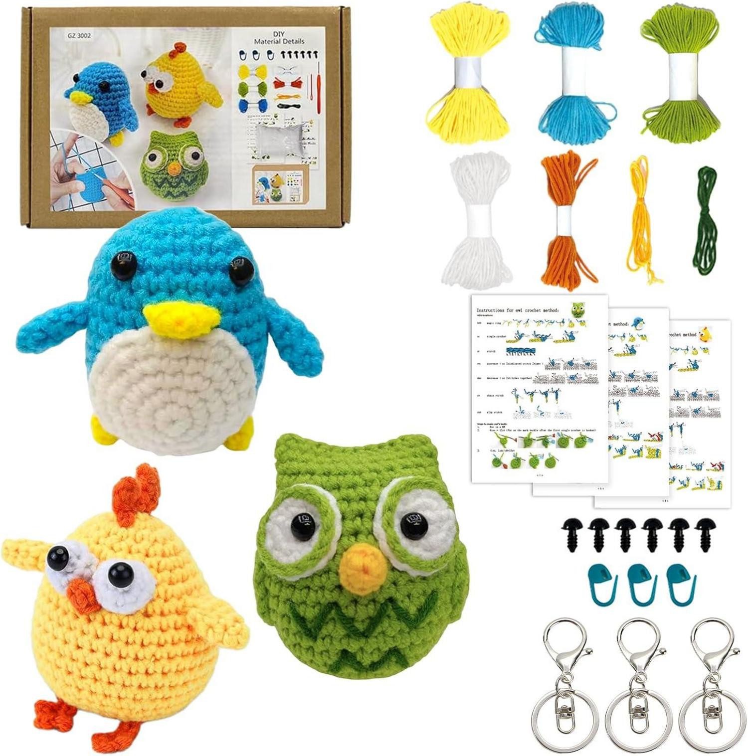 Das Ruikdly 3 Häkelset für Anfänger Tiere bietet die Möglichkeit, 3 entzückende Tiere zu kreieren. Das Set enthält hochwertiges Garn, eine Häkelnadel, 2 Nähnadeln, 3 Maschenmarkierer, 6 Ösen, 3 Schlüsselanhänger, eine Packung Polyester-Füllung und eine detaillierte Schritt-für-Schritt-Anleitung auf Englisch. Dieses Set ist perfekt, um ein neues Hobby zu entdecken und kreative Fähigkeiten zu entwickeln.