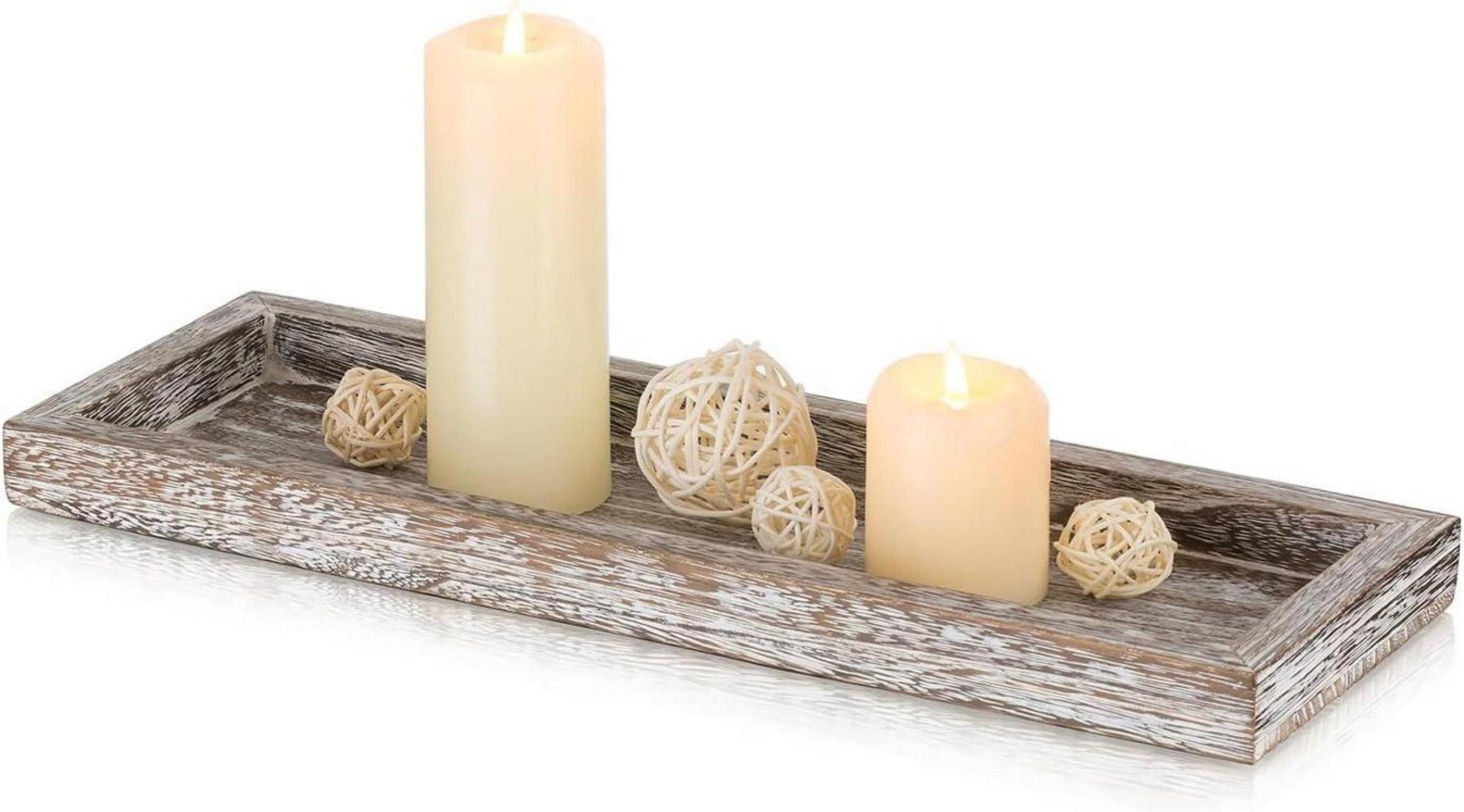 Deko Tablett Produktinformation: Maße - 15”*5”, das rechteckige Holztablett ist aus hochwertigem Kiefernholz gefertigt und weist eine einzigartige organische Holzmaserung auf, die rustikale Ästhetik und modernes Bauernhausdekor ergänzt. Verwende das geschmückte hölzerne längliche Dekotablett als zentrales Dekorstück auf deinem Esstisch, Kamin oder Sideboard, um sofort die gemütliche Atmosphäre zu Hause zu verstärken. Es kann auch als Küchenorganisator für Öl, Salz und Pfeffer dienen. Ob du einen klassisch raffinierten Look oder eine verspielte und bunte Anordnung bevorzugst, unser längliches Holz Kerzentablett bietet grenzenlose Möglichkeiten. Festliche Dekoration: Das Deko Kerzentablett länglich dient als perfekte Dekoration, um eine festliche Atmosphäre zu schaffen. Arrangiere bezaubernde Oster-Kerzen, wie etwa Hasen- oder Ei-förmige Kerzen, um eine verspielte Note hinzuzufügen. Erwäge, frische Blumen oder dekoratives Gras um die Kerzen herum zu platzieren, um die Schönheit eines Frühlingsgartens zu beschwören. Pflanztablett: Nutze es als Basis für Topfpflanzen, um nicht nur überschüssiges Wasser aufzufangen, sondern auch Unordnung zu verhindern. Holz Dekoratives Tablett: Platziere es auf deinem Couchtisch oder Sofa, um Kerzen, Vasen oder kleine Skulpturen zu präsentieren und sofort eine stimmungsvolle Atmosphäre zu schaffen.