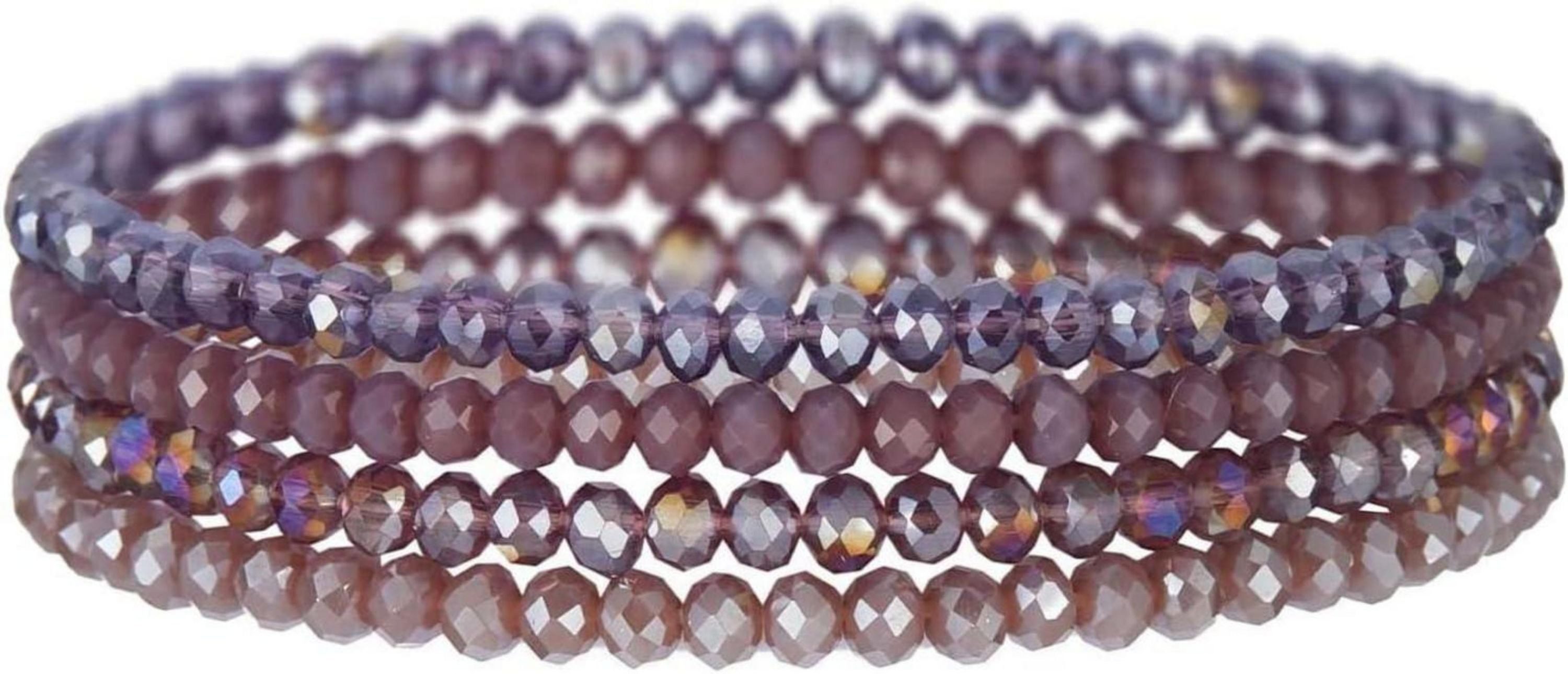 Das Set besteht aus vier mehrschichtigen Armbändern in den Farben Schwarz und Lila, die mit hochwertigen facettierten künstlichen Kristallen verziert sind. Diese Armbänder können einzeln für einen subtilen Look oder zusammen für einen auffälligen, geschichteten Effekt getragen werden.