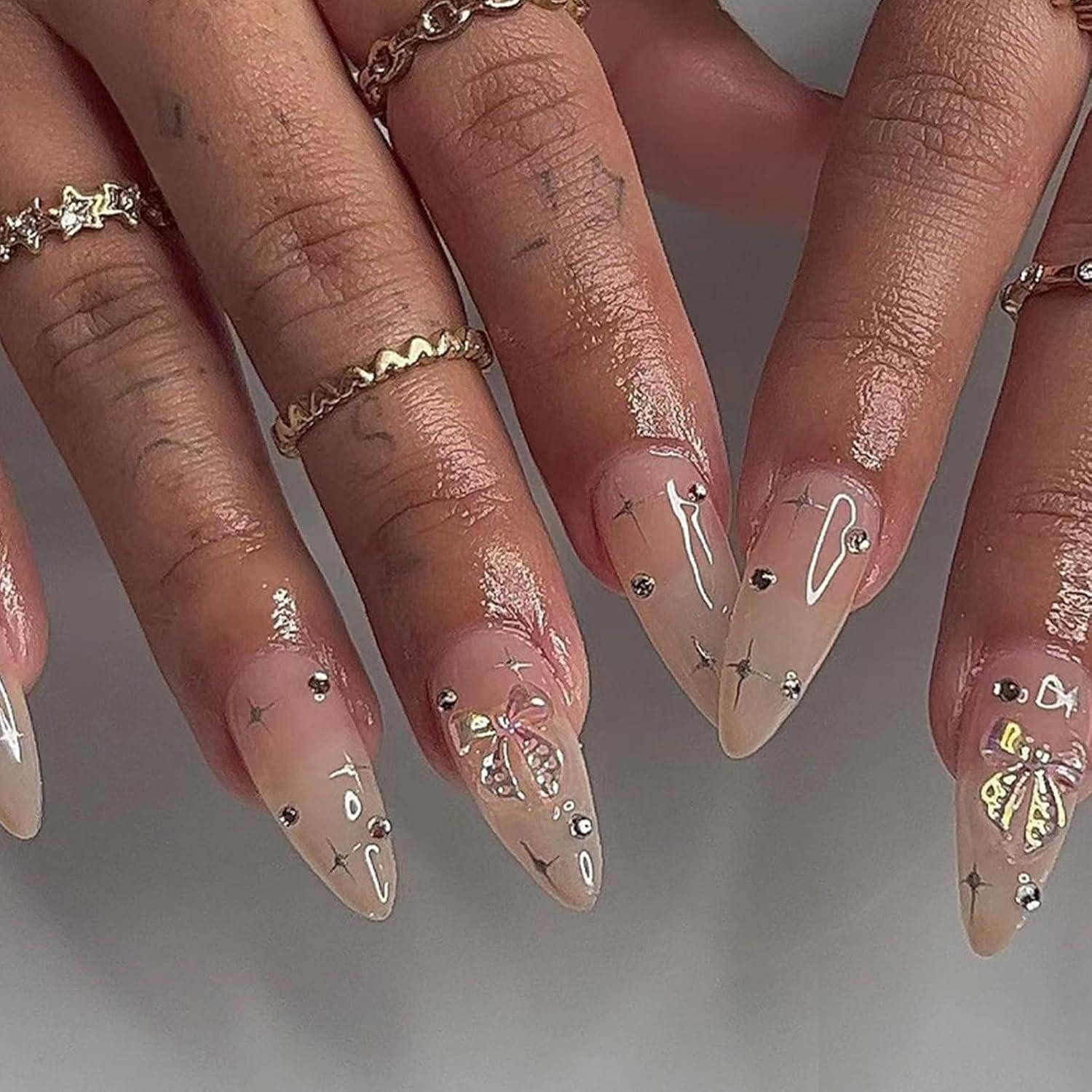 Komplettpaket & DIY Nägel: Enthält 24 Stück Mandel Falsche Nägel in verschiedenen Größen, eine Mini-Nagelfeile, einen kleinen Holzstab und ein Blatt Nagelkleber-Aufkleber für individuelle Anpassung Ihrer Nägel.
