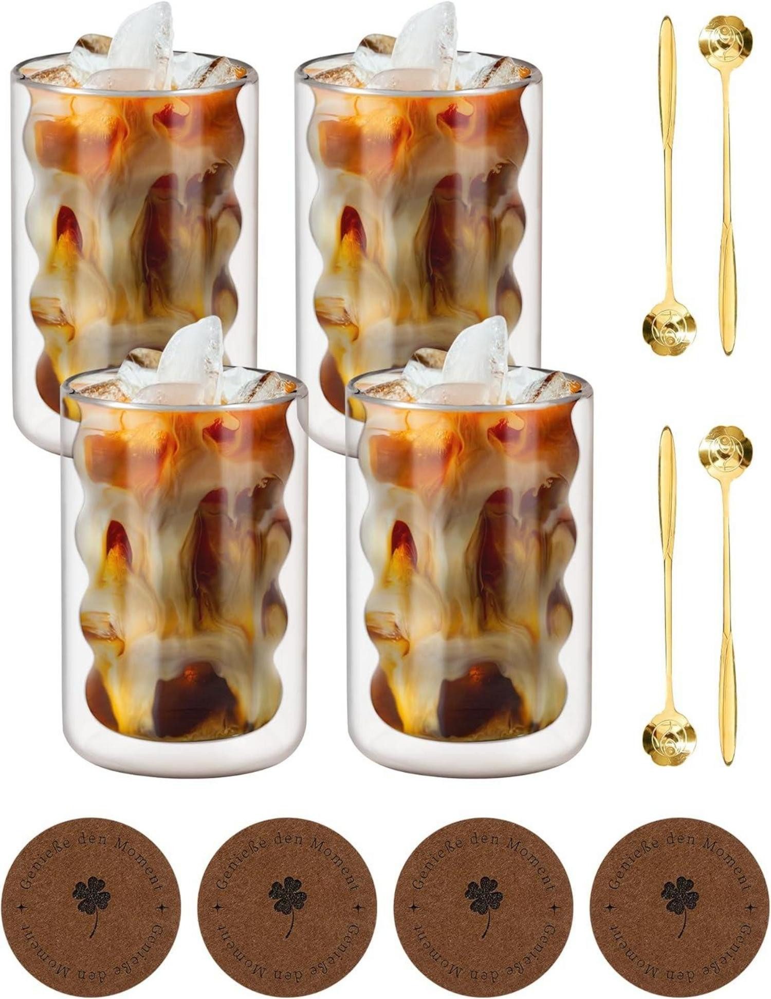 Erweiterte Artikelbeschreibung: Das Latte Macchiato Gläser Set mit 4 Löffeln und 4 Untersetzern bietet ein elegantes und vielseitiges Erlebnis für den Kaffeegenuss. Die doppelwandigen Gläser aus Borosilikatglas sind nicht nur robust und hitzebeständig, sondern auch ästhetisch ansprechend mit ihrem Wasserwellendesign, das die Schichtung des Kaffees betont. Die 350 ml fassenden Gläser sind ideal für eine Vielzahl von heißen und kalten Getränken und sorgen dank der doppelwandigen Konstruktion für eine effektive Wärmedämmung. Das Set eignet sich auch hervorragend als Geschenk dank der personalisierten Untersetzer und dem hochwertigen, bruchsicheren Glasmaterial. Genießen Sie Ihren Latte, Cappuccino oder andere Getränke in diesen stilvollen Gläsern und erleben Sie einzigartigen Kaffeegenuss zuhause oder im Büro.