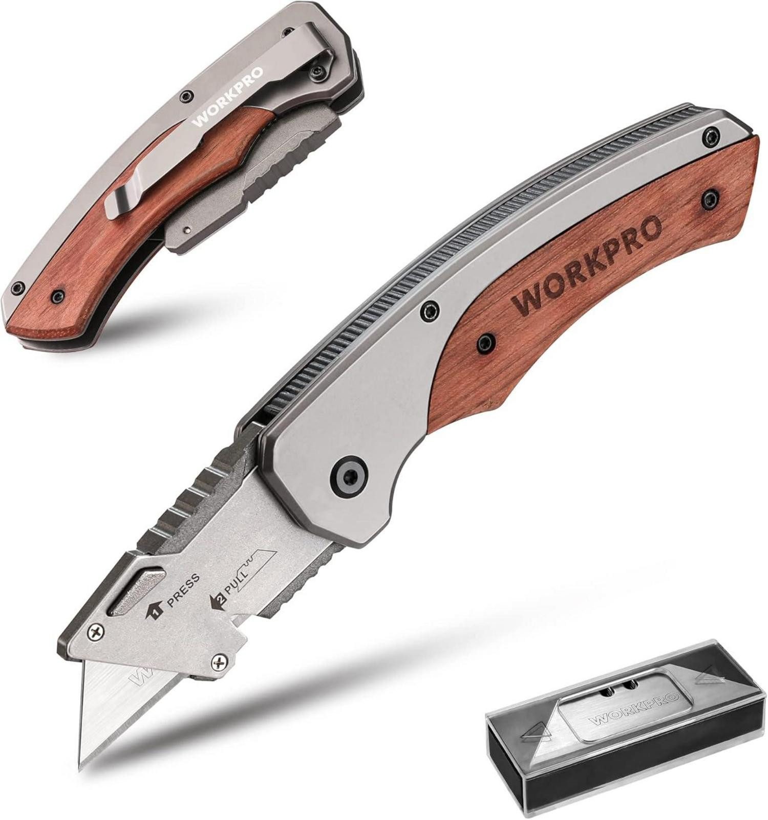 WORKPRO Faltbares Universalmesser Klappmesser mit Holzgriff, Teppichmesser Cuttermesser mit Gürtelclip und Liner-Lock-Design, inkl. 10 Ersatzklingen