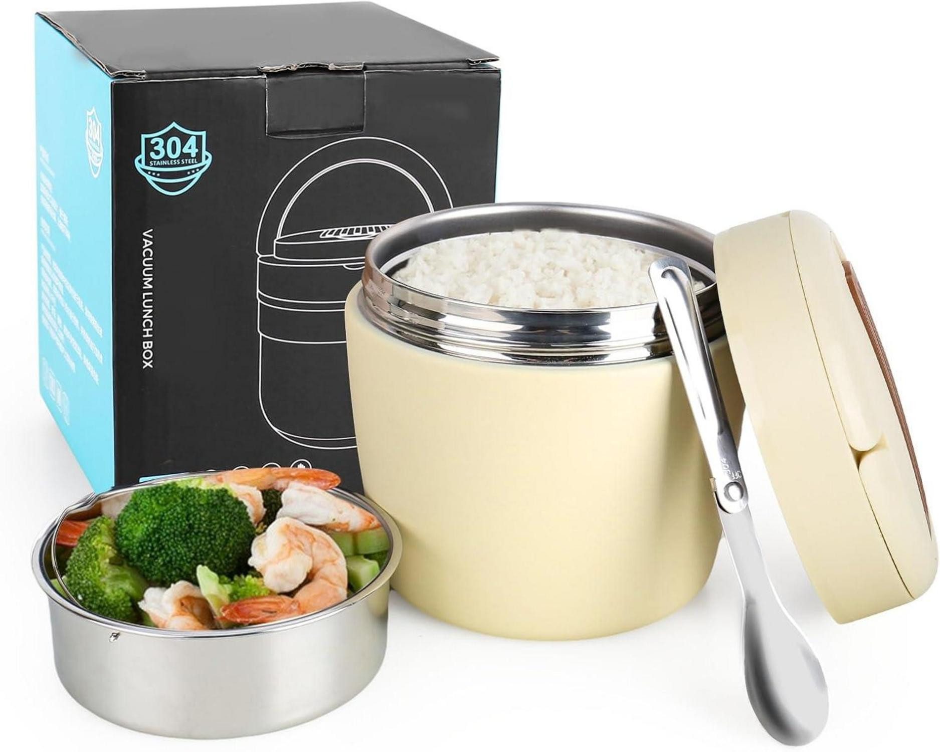 Auslaufsicherer Lunchpot Lunchbox die Abdeckung hat eine doppelte Schutzschicht. Wenn sie fest aufgeschraubt ist, ist sie komplett luftdicht und verhindert so jegliches Risiko von Leckagen oder Feuchtigkeit, wenn Sie unterwegs sind. Thermo lunchbox der Becherdeckel kann als Serviergefäß verwendet werden und wird mit einem eigenen Edelstahllöffel geliefert, damit Sie jederzeit eine Mahlzeit genießen können.