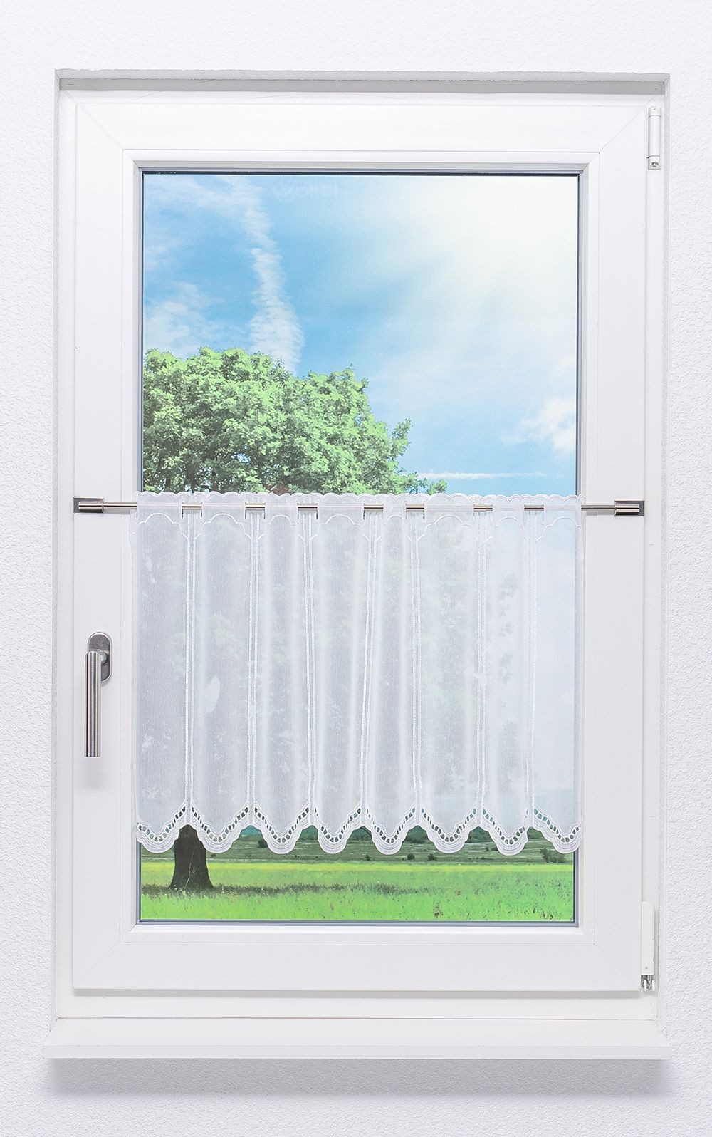 Diese Scheibengardine bringt neuen Schwung an Ihr Fenster, und das im wahrsten Sinne des Wortes. Zierbögen verleihen dem Design eine moderne und gleichsam sehr lebendige Ausstrahlung. Schwungvoll gestaltet ist auch der untere Saum mit seinen luftigen Cut-Outs. Wie ein Schleier umspielt der Behang jede Glasfront. Neben dem weichen Fall ist es vor allem die Transparenz, die den Polyesterstoff attraktiv und interessant für viele Wohnstile macht. Gardinen mit durchscheinenden Stoffen sorgen dafür, dass Räume in möglichst viel Tageslicht getaucht werden, ohne dass die Sonne zu sehr blenden kann. Der Blick nach draußen bleibt dabei weitgehend frei, und Sie könne sich ein bisschen von der Umgebung nach drinnen holen. Der praktische Stabdurchzug am oberen Saum macht die Bistrogardine flexibel einsetzbar. In wenigen Handgriffen ist sie am Fenster befestigt, genauso schnell wieder abgenommen. Mit ihren pflegeleichten Eigenschaften kann sie ebenfalls punkten. Die Fensterdeko können Sie schonend bei 30 Grad in der Maschine waschen..
