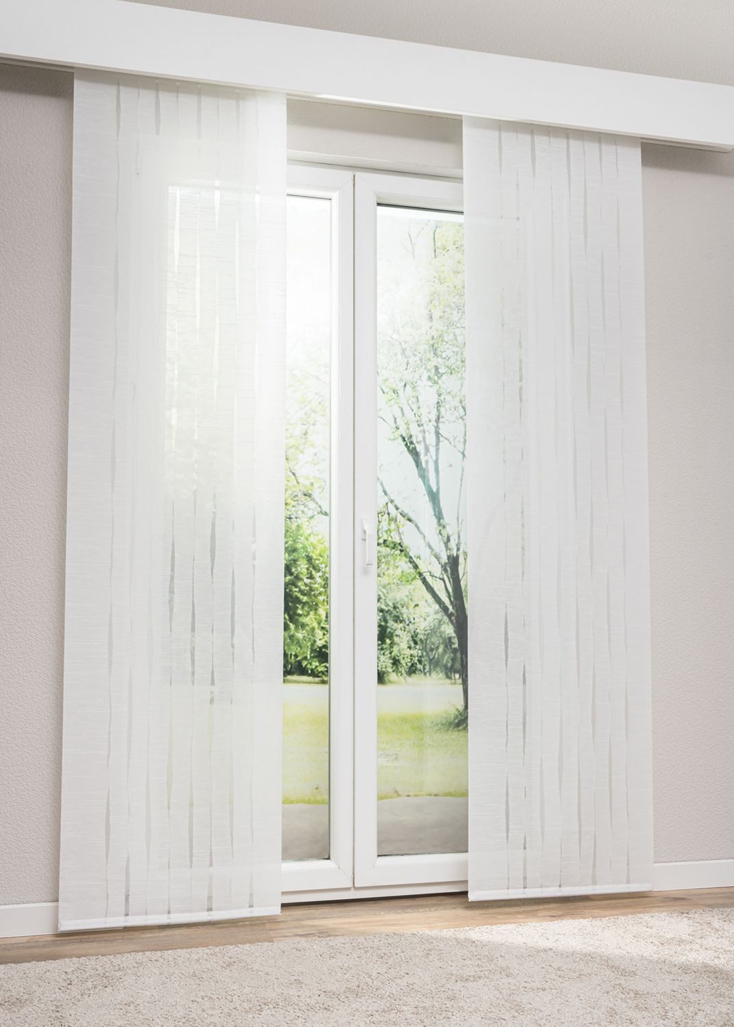Lieferumfang | Eine Schiebegardine aus halbtransparentem Stoff MontagematerialPaneelwagen Passende Befestigung für alle gängigen Gardinenschienen Klettband zur Befestigung des Vorhangs am Paneelwagen Beschwerungsstab Waschanleitung |