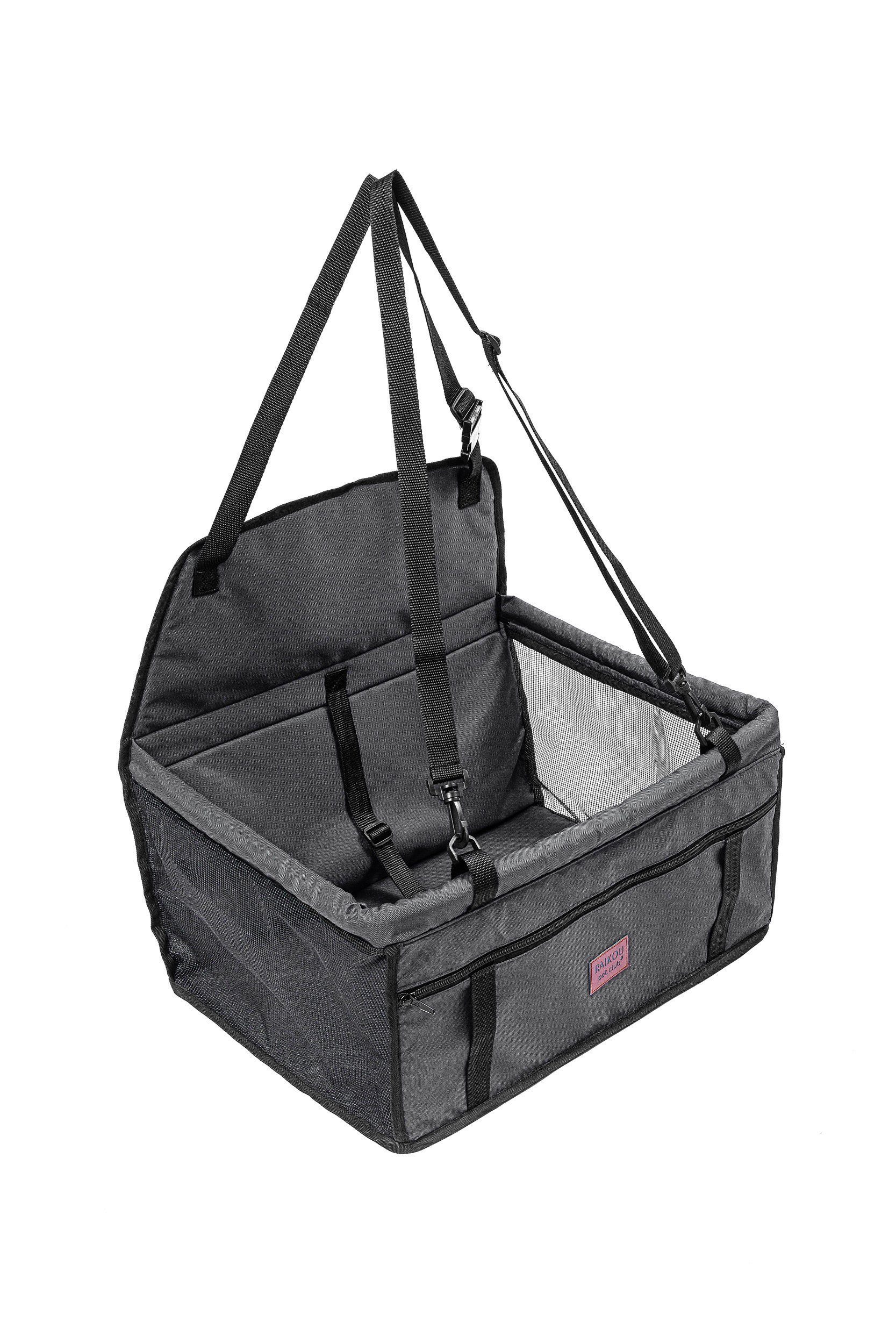 Haustier-Autositz, Stabiler Autositz für Kleine Bis Mittelgroße Hunde, safety-seat for pets, 50cm*40cm*24cm (L*B*H) ● Schnell & Universal: Unser Transportsitz für kleinere Haustiere ist durch die Schlaufen sehr einfach und an vielen Fahrzeugen, schnell angebracht. Всеs was Ihr Fahrzeug dafür benötigt, ist eine Kopfstütze und schon können Sie Ihrem 4-Beiner in die Box helfen und anschnallen. ● Sicher: Unser Entwurf ist sicher! Denn es hat 4 Seiten, damit Ihr Haustier bei holprigen Fahrten nicht in den Fußraum geworfen oder gegen den Vordersitz gestoßen werden kann. Außerdem bietet es einen Fixierpunkt, damit sind Ihre Liebsten immer gesichert. Glasfaserstäbe und Kunststoffplatten sorgen dabei für die nötige Stabilität! ● Abwaschbar: Wir wissen, ein Ausflug ist immer aufregend und dabei kann immer etwas daneben gehen! Darum fiel unsere Materialwahl auf reines Polyester Oxford und Polyester Mesh, das macht unseren Sitz immer abwischbar und das Polster kann sich nicht vollsaugen. ● Material: 100% Polyester Oxford und Mesh ● Stauraum: Auch an Stauraum ist gedacht, hinter dem Reißverschluss befindet sich Platz für viel Spielzeug, Mitbringsel oder Kleinigkeiten!