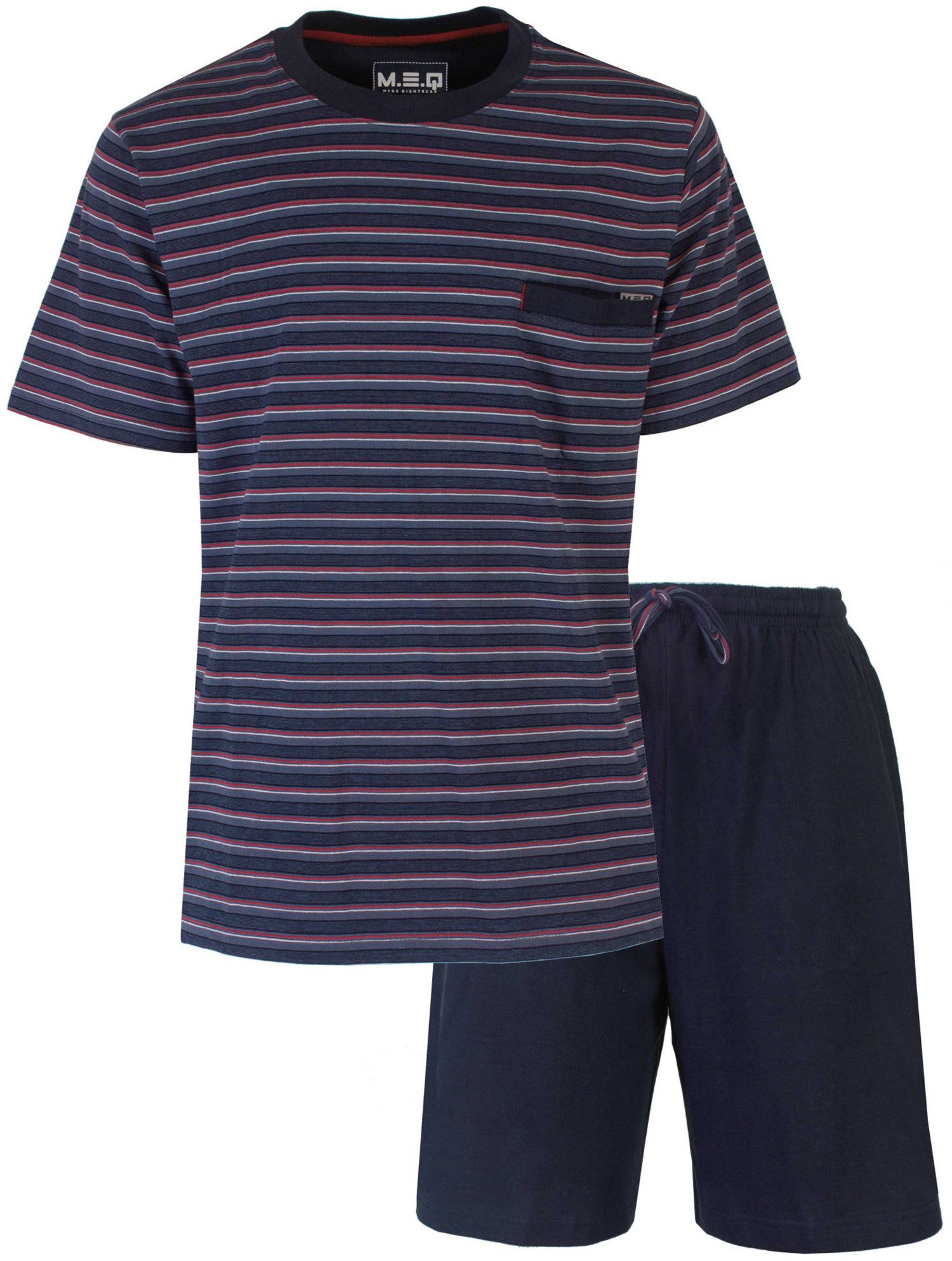 Der M.E.Q. Herren Schlafanzug zeichnet sich durch seine komfortable und bequeme Ausführung aus. Das Oberteil verfügt über kurze Ärmel und einen Rundhalsausschnitt, was für optimale Bewegungsfreiheit und Atmungsaktivität sorgt. Die kurze Hose ist am Bund mit einem Gummizug ausgestattet und verfügt zusätzlich über einen Tunnelzug, um die Passform individuell anzupassen. Die Verwendung von 100% Baumwolle und Melange: 85% Baumwolle, 15% Polyester, als Material gewährleistet ein angenehmes Tragegefühl und sorgt dafür, dass der Schlafanzug besonders hautfreundlich ist. Baumwolle ist bekannt für ihre Atmungsaktivität und ihre Fähigkeit, Feuchtigkeit von der Haut aufzunehmen, was gerade für einen erholsamen Schlaf von Vorteil ist. Praktisch und funktional ist die Brusttasche auf der linken Seite des Oberteils, die Platz für kleine Utensilien bieten kann. Insgesamt ist dieser Schlafanzug eine ideale Wahl für gemütliche Nächte und entspannte Stunden zuhause.