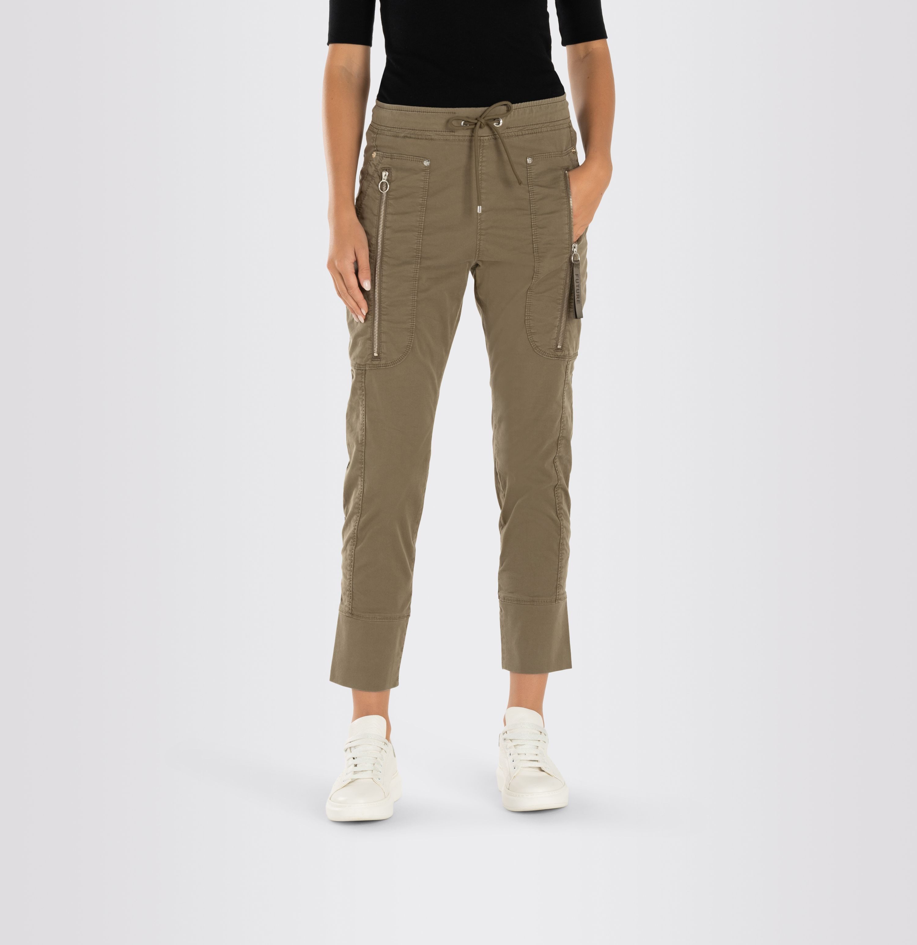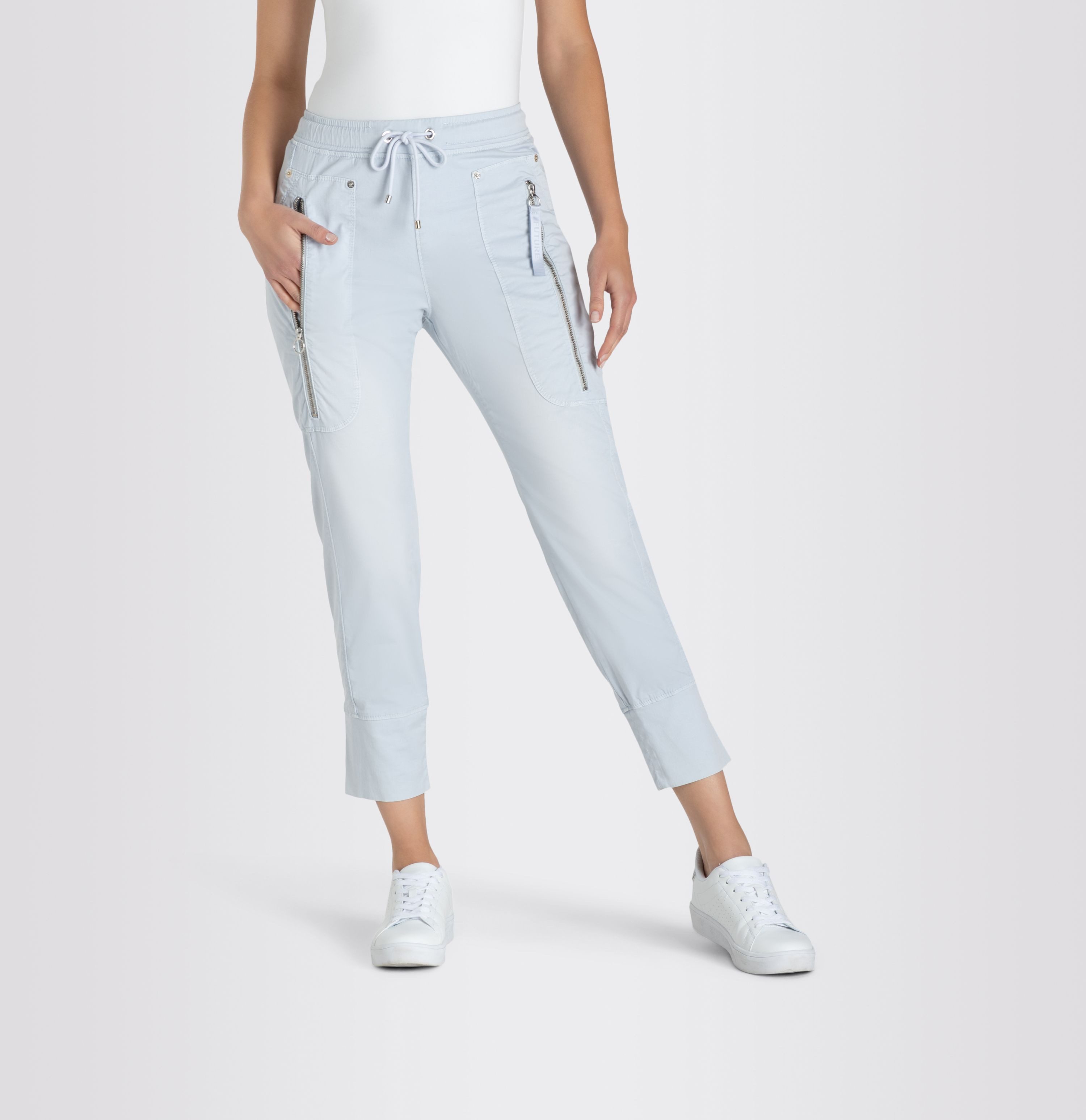Relaxed Slim Fit, schmal zulaufendes Bein, normale Leibhöhe, Bund mit Kordelzug, Jump-In-Modell, moderne Taschenlösung mit Reißverschluss vorne, Bündchen am Beinabschluss, hochwertige, sehr elastische Stretch-Qualität, weicher Griff, sportiver Look, hoher Tragekomfort, pflegeleicht, Das Model ist 1,75m groß und trägt die MAC Hosengröße 36, Fußweite bei Размер 36: 27cm
