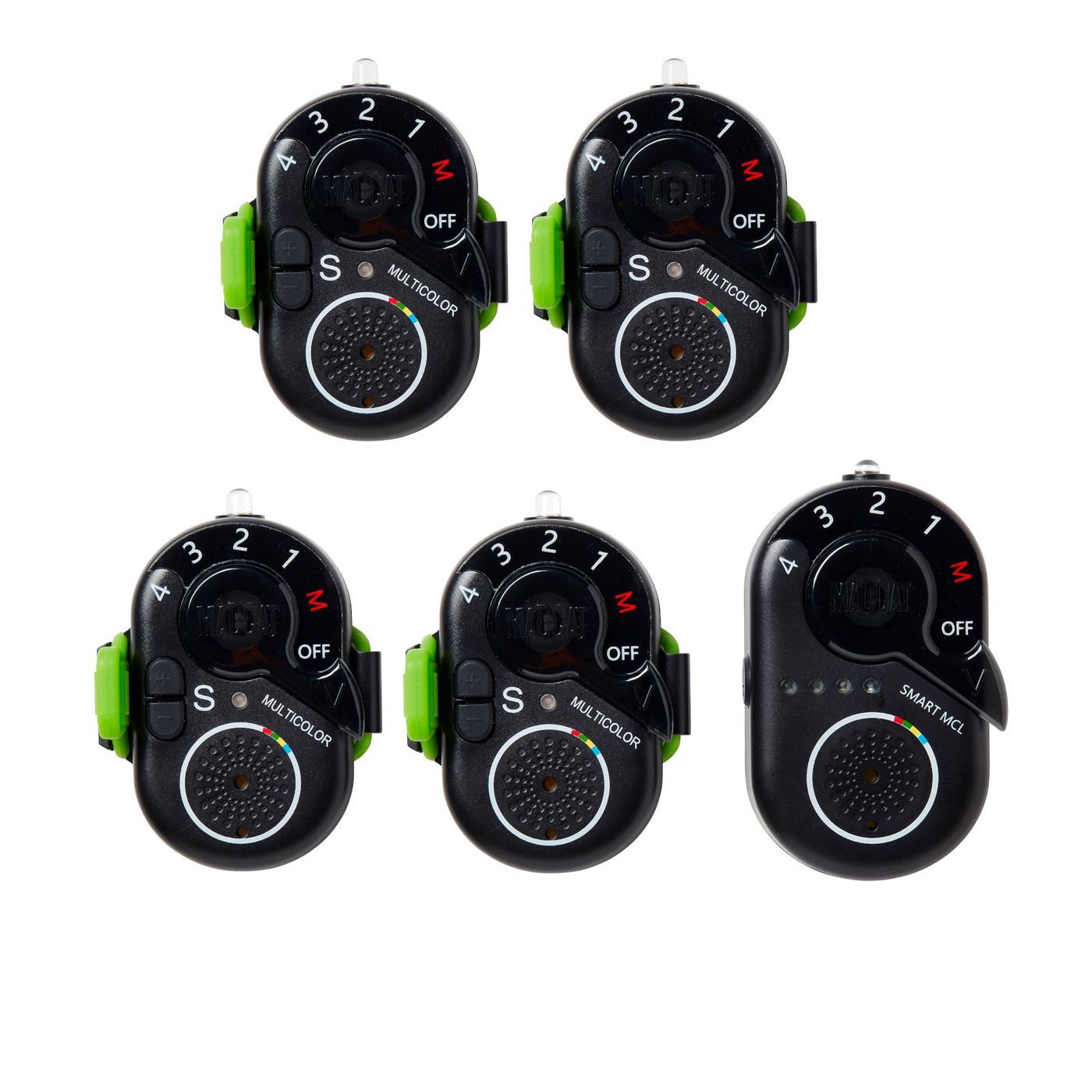 Madcat Smart Alarm Mcl Set 4+1 Multicolor - Bissanzeiger Set - Das Set aus dem Hause Madcat besteht aus vier Bissanzeigern und einem Receiver. Sie überzeugen durch ihre Funktionalität, die Leistung und das Design. Die Bissmelder erkennen nicht nur Vibrationen, sondern besitzen auch eine Anzeige zur Erkennung von Fallbissen. Sie verfügen über mehrfarbige LEDs, sind wasserfest und haben dank der FM-Modulation, die weniger durch Hindernisse beeinträchtigt wird als herkömmliche AM-Bissanzeiger, eine Reichweite von etwa 100m. Mit einem V-Drehknopf für die Lautstärke und einem S-Drehknopf für die Empfindlichkeit sind diese Bissanzeiger äußerst benutzerfreundlich. Vor allem beim Fischen auf Waller sind diese Bissmelder die richtige Wahl.