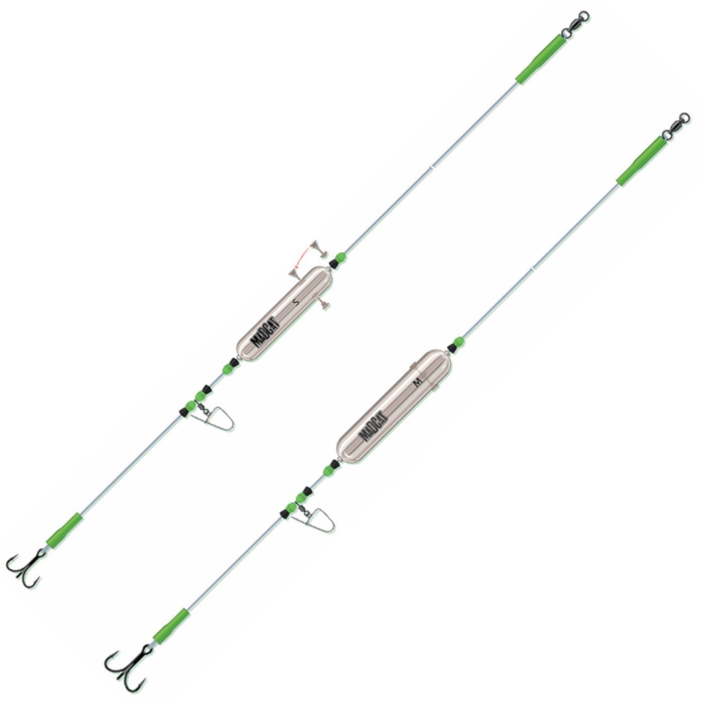 Madcat Adjustable River Rigs Nose Clip 250cm 1,30mm - Wallervorfach - Das Vorfach aus dem Hause Madcat ist ein gutes Rig, das mit einer Adjustable Subfloat versehen ist, um einen Köderfisch zu montieren. Der große Vorteils des Nasenclips besteht darin, dass sich der Wels immer am Drilling hakt, was zu einer höheren Fangquote führt. Es ist geknüpft mit 1,30mm dickem Ultra-Soft-Mono-Vorfach. Die Gesamtlänge beträgt 250cm und die Brustlast beträgt 165lb.