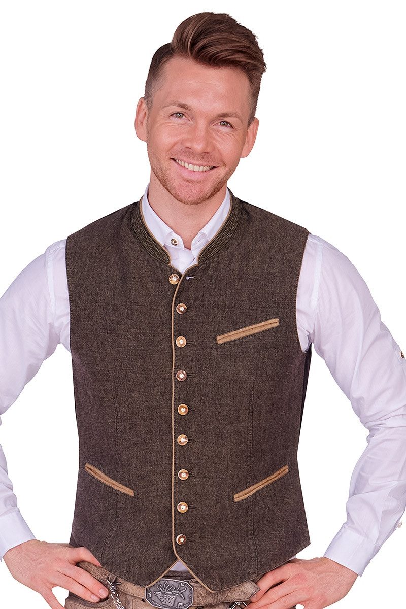 Die krachige Herren Trachtenweste Oliver in Kiesel bzw. Oliv aus dem Hause Maddox ist leicht tailliert geschnitten und hat einen typischen Stehkragen. Vorn besteht das rustikale Gilet aus feinem Leinen und hat eine zünftige Optik durch das Webmuster aus Garnen in zwei Farben in Leinwandbindung-Art und eine angenehme Haptik. Der schicke Stehkragen ist verstärkt, außen mit klassischen, leicht glänzenden Stickereien in Beige bzw. Grün verziert und mit einer Paspel in Hellbraun aus Velours-Material betont. Auch die mit urigen Knöpfen im Hirschhorn-Stil besetzte Knopf- sowie Knopflochleiste sind mit einer hellbraunen Velours-Paspel abgesetzt und die Brusttasche links sowie die beiden Eingrifftaschen vorn mit doppelten Paspeln aus Velours-Material in Hellbraun gearbeitet. Der klassische, schwarze Westenrücken glänzt dezent und hat einen verstellbaren Rückenriegel mit einer Schnalle in Anthrazit für den perfekten Sitz. Das angenehme Karo-Futter mit hohem Baumwoll-Anteil und die Innentasche mit Knopf und Knopfschlaufe links machen die kernige Herrenweste perfekt. Bitte beachten Sie ab Размер 56 die Größenzuschläge.