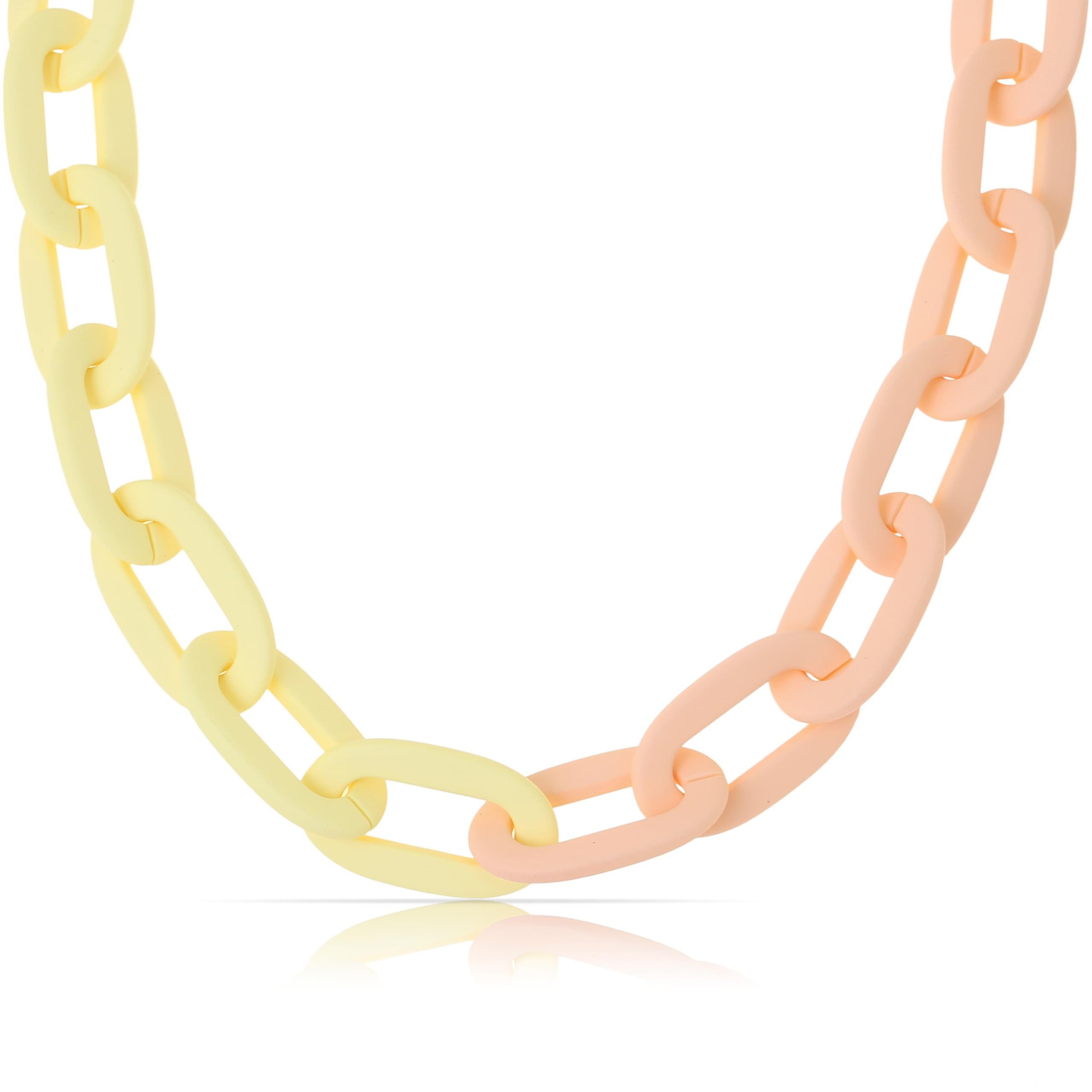 » Unsere dicke Kette Damen besticht durch große, 2,1 cm breite Glieder, die gegeneinander gewunden sind. Die Kette Choker Gelb ist 40 cm lang und kommt zusätzlich mit einer 5 cm Verstellkette in Silber, perfekt, um Deinen Look individuell anzupassen.